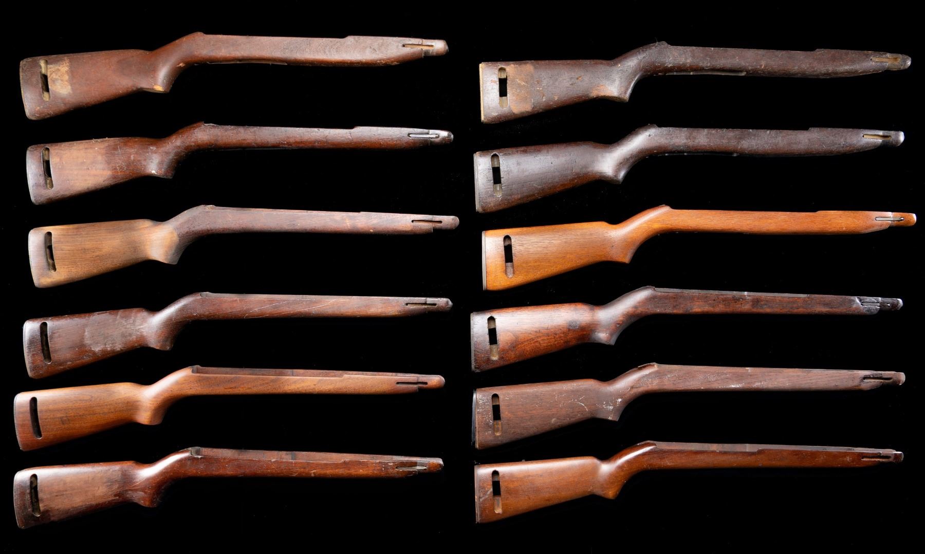 No.1: Walnut Reproduction Highwood oval-cut stock. Stock is marked faintly in sling slot "JMB". No hardware included. CONDITION: stock has worn oil type finish w/ numerous handling marks. Rectangular inletting at bottom of forend w/ two screw holes. / No.2: Walnut stock low-wood oval-cut. Stock is marked in sling slot "M-U". No hardware is included. CONDITION: stock has wear & handling marks throughout. Notable areas of removed finish on both sides of butt & end of pistol grip. / No.3: Walnut stock low-wood oval-cut. Stock marked on right side of butt w/ "crossed cannons". CONDITION: stock has worn arsenal rework refinish w/ notable loss of wood in buttplate area. / No.4: Walnut low-wood oval-cut. Stock marked ".U." in sling slot & left side of butt. Encircled "P" proof at end of grip. Stock has very faint boxed "crossed cannons" & "HD" on right side of butt. CONDITION: stock has worn arsenal rework refinish w/ areas of removed finish on butt. No hardware is present. Two brass pinned repairs at forend. / No.5: Walnut stock low-wood oval-cut. Stock marked only w/ obscured "crossed cannons" on right side of butt. CONDITION: stock has lightly worn arsenal rework refinish. No hardware is present. / No.6: Walnut low-wood oval-cut stock. Marked in sling-slot "S-HB" & marked "P" under grip. No hardware is included. Stock has extensive wear & handling marks over an arsenal rework refinish. Finish has been sanded on both sides of butt. / No.7: Walnut low-wood oval-cut stock. Stock is marked "IO" in sling slot & "29" rack number at end of grip. CONDITION: stock has well-worn original finish w/ numerous handling marks. Extensive fine crack on right side of forend. Finish has been partly removed on both sides of butt. / No.8: Walnut low-wood oval-cut stock. Stock marked "I.R." in sling slot. Buttplate marked "PM-IP" is included, but does not fit inletting. CONDITION: stock has wear w/ numerous handling marks & spots of white paint throughout. / No.9: Walnut pot-belly stock. Stock is marked "SA" on left side of barrel channel on forend. Includes no hardware. CONDITION: stock has wear & extensive handling marks throughout w/ an arsenal rework finish. / No.10: Stained hardwood stock. Pot-belly stock is likely of foreign origin. Includes no hardware. CONDITION: coarse finish w/ extensive wear & handling marks. / No.11: Dark stained hardwood M2 pot-belly stock. Stock is unmarked & contains no hardware. CONDITION: stock has extensive wear & handling marks. Notable crack along bottom of forend. / No.12: Hardwood lightly stained M2 pot-belly stock. Unmarked stock includes buttplate, recoil plate & band spring. CONDITION: stock has light wear & handling marks. (02-24590-41/RW). NON-GUN. $600-900.