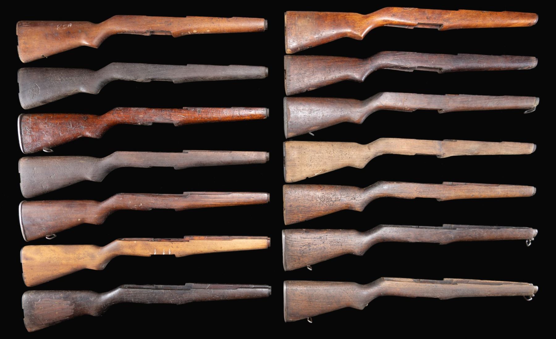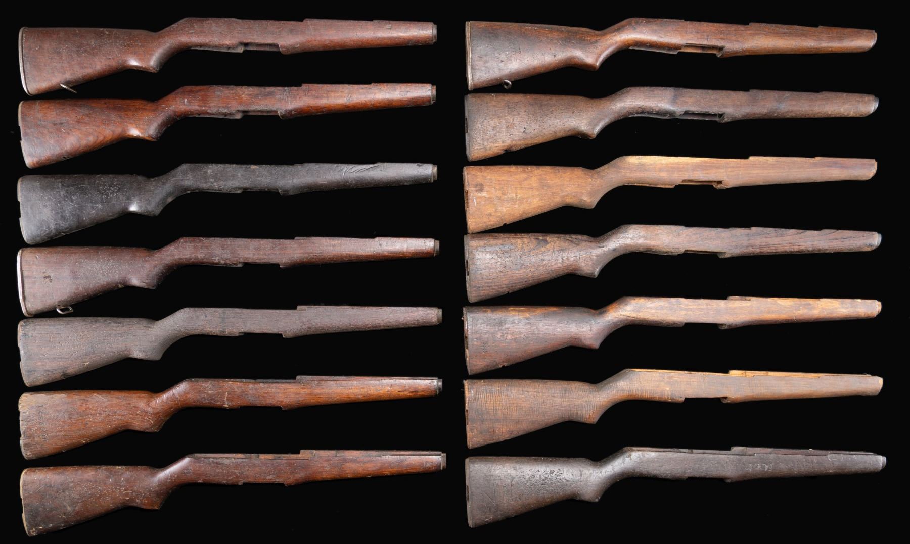 These buttstocks appear to have been removed from imported rifles & have seen extensive hard service. Many if not most of the stocks are of unknown hardwood & are of indeterminate origin. Stocks may retain some of their metal fittings, including buttplates, ferrules & swivels. Some of the buttplates are noted to be of a simple stamped construction w/o traps. CONDITION: stocks have heavy wear, staining, handling marks & cracking issues. (02-24590-33/RW). NON-GUN. $400-700.