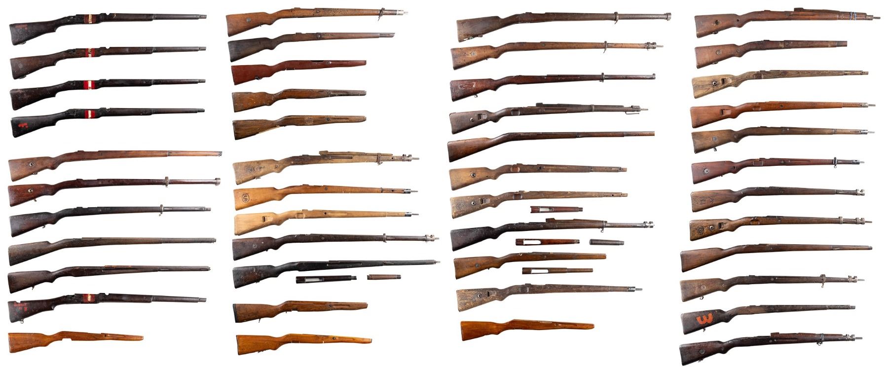 Stocks are predominantly for a wide variety of Mauser type rifles from various manufacturers. Group contains seven SKS type stocks and five British pattern 14 drill purpose stocks. Notable stocks include, but are not limited to, Mauser M71 single shot infantry rifle stock, GEW 98 infantry rifle stock, with most furniture and handguard, German KAR98 stock with handguard, three Siamese Mauser stocks, one 1908 Brazilian long rifle with handguard and furniture, several Czech Vz24 stocks, unfinished K98 Mauser stock with grasping grooves. Many stocks have Chinese markings on butt. These stocks appear to be a mix of Chinese and European manufacture. The seven SKS type stocks include one red synthetic Chinese buttstock and one Yugo Model 59/66. Balance of stocks appear to be Chinese manufacture. The five British pattern 14 drill rifle stocks with their colorful red and white stripes retain their original buttplates and long range auxiliary sight discs. CONDITION: stocks have a wide range of condition and some retain portions of their metal furniture, the majority of the stocks appear to be in a serviceable condition. Stocks will have the normal wear, staining, handling marks, chips and small cracks expected with long hard service. (02-25371-3/RW). NON-GUN. $700-900.