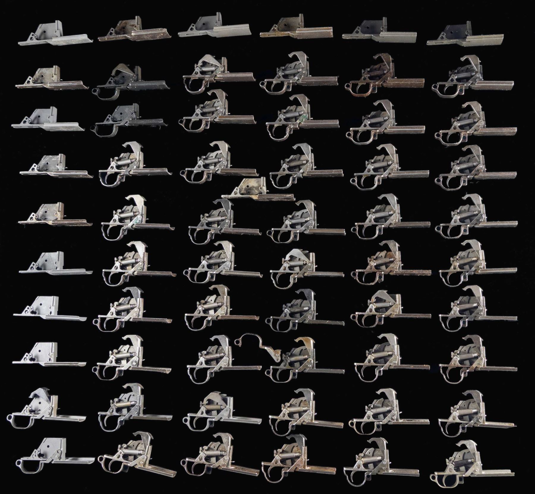 TRIGGER GUARD ASSEMBLIES AND TRIGGER HOUSINGS. Very large group of M1 Garand trigger guard assemblies & stripped trigger housings. Trigger guard assemblies are generally complete. All trigger housings are marked w/ Springfield Armory's "SA". Assemblies may contain individual parts by other makers. Trigger guards are a mix of stamped & milled types. Total count is 43 complete trigger guard assemblies & 21 stripped trigger guard housings. CONDITION: ranges from the majority having well-worn, but serviceable appearance to a few appearing to be unissued. 3 trigger housings are new-in-wrapper. (02-24590-12/RW). NON-GUN. $900-1,200.