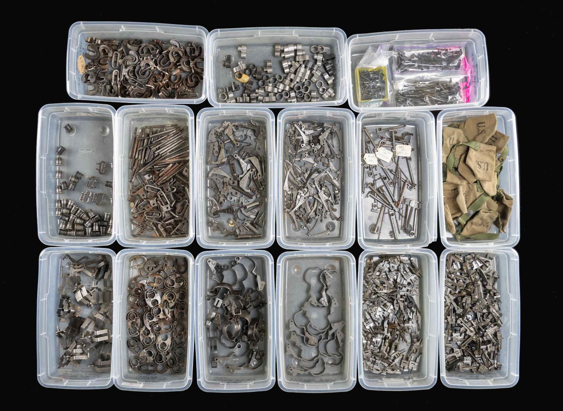 Included is a large quantity of assorted M1 Garand rifle parts to include milled & stamped trigger guards, bullet guides, follower arms, clip latches, operating rod catches, followers, firing pins, hammers, triggers, safeties, gas cylinder locks w/ screws, stock ferrules most w/ swivels, front handguard ferrules, butt swivels & screws. Also included are 18 WWII dated canvas muzzle covers. CONDITION: the parts, to numerous to count, are generally well-worn, but most appear serviceable. (02-24590-26/RW). NON-GUN. $900-1,200.