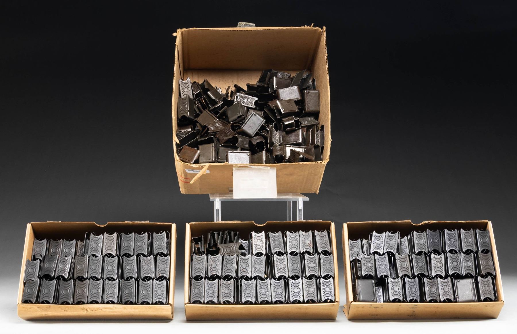 EN BLOC CLIPS. Approx. 300 are packed in 100 round cardboard boxes. The balance are thrown loose in a box approx. 12" x 12" x 5" deep. Various assorted makers marks include "SA", "MB7" & "NW". CONDITION: the clips packed in boxes appear to be all unissued & unused. The balance of the clips, which are packed loose, are well-worn w/ missing finish & scattered areas of light oxidation, but most appear serviceable. (02-24590-10/RW). NON-GUN. $500-700.