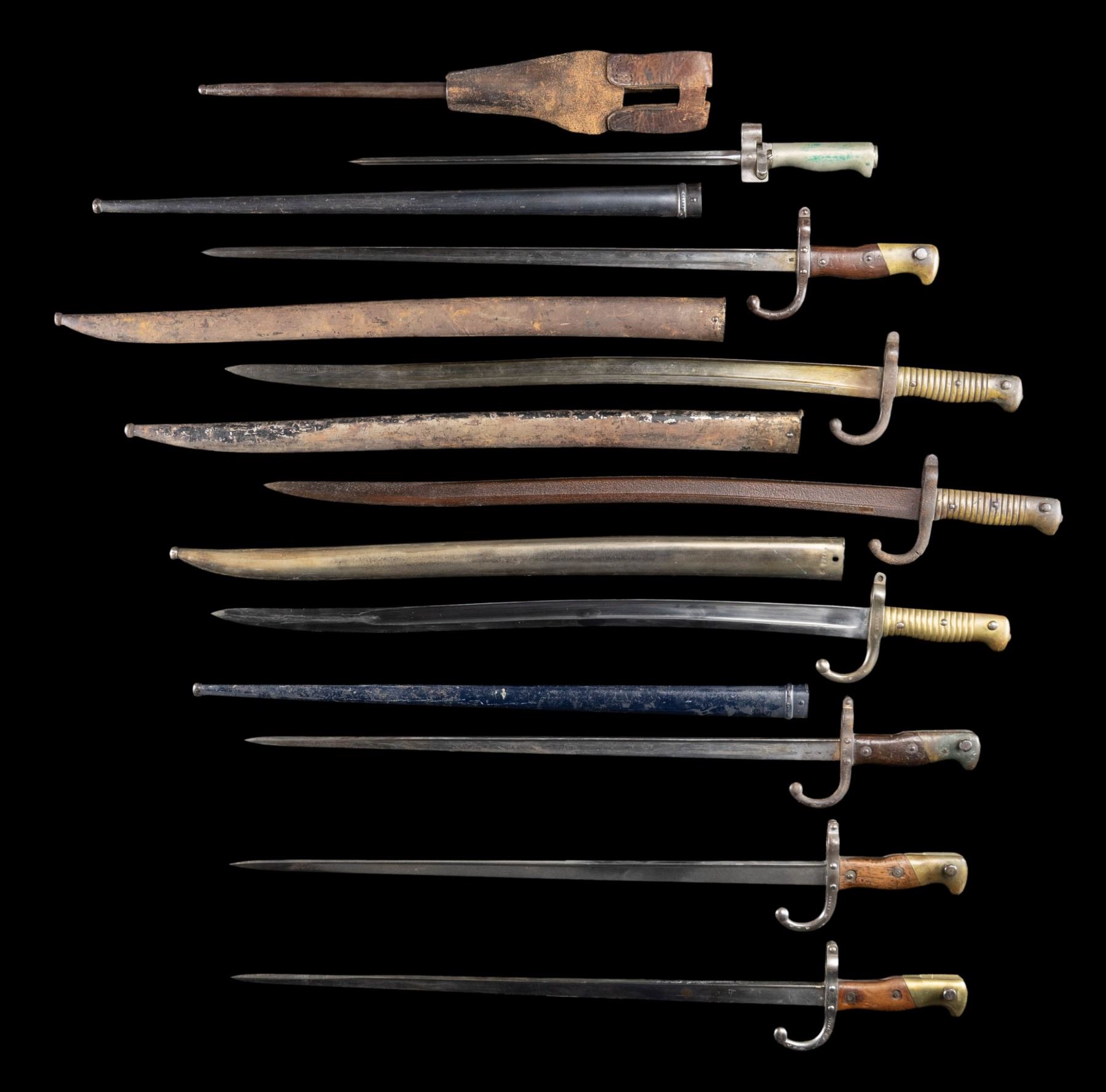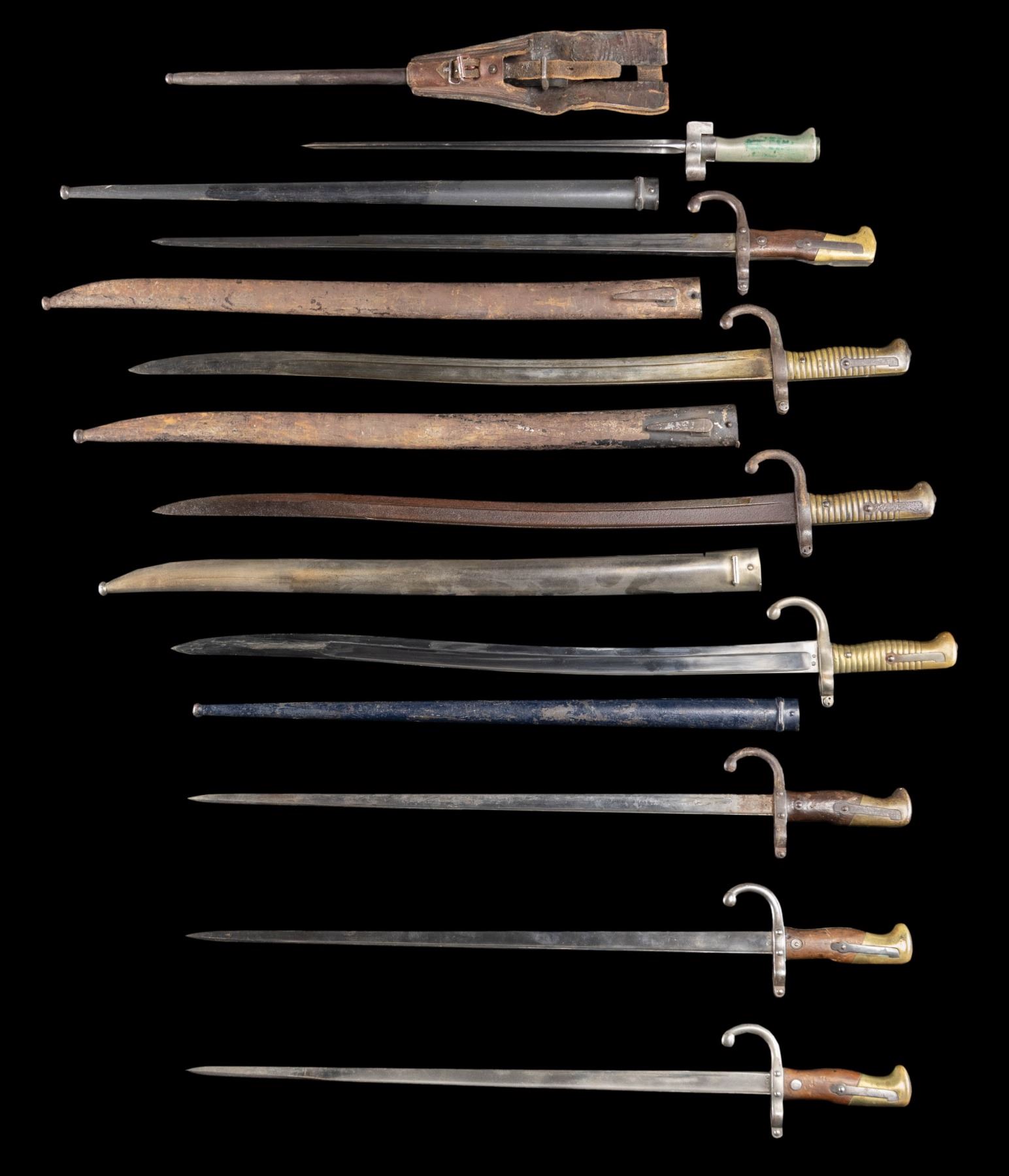This lot consists of the following: 1) French 1874 Gras Bayonet. No scabbard present. Blade has St. Etienne markings. CONDITION: blade appears lightly cleaned to bright with scattered oxidation. Crossguard is a dull gray patina with oxidation & some bright areas. Wooden handles appear sanded with some cracks, dings & chips. Brass pommel is a dull yellow color with some oxidation & dings. 2) French 1874 Gras Bayonet. No scabbard present. Blade has Chatelherault marking with 1879 date. CONDITION: blade & crossguard are partially bright with scattered oxidation staining. Brass pommel is a dull yellow with oxidation staining. Grips are missing a washer & show some dings, scratches & light cracks. 3) R35 Lebel Bayonet. Scabbard & leather frog present. CONDITION: metal shows scattered oxidation & staining. Scabbard shows scattered flaking, edge wear & oxidation. Frog shows overall crazing & flaking. 4) 1866 Chassepot Bayonet. Matching scabbard present. CONDITION: metal parts of bayonet & scabbard cleaned with areas being gray & others bright, & some scattered light oxidation.. 5) 1866 Chassepot Bayonet. 1867 dated blade. Scabbard & crossguard have two different unit markings that both appear to be German. One reads "87. L U.2165". Other is different but illegible due to oxidation. CONDITON: metal parts of bayonet & scabbard show varying degrees of oxidation, areas turning gray & some dings. Scabbard is missing its throat screw. 6) 1866 Chassepot Bayonet. Scabbard present but due to oxidation CONDITION: metal parts of bayonet & scabbard are varying degrees of oxidized patina with bayonet having old pitting throughout. 7) French 1874 Gras Bayonet. 1878 date & Chatellerault marking. Matching scabbard present. CONDITION: blade is partially bright with oxidation & age wear. Other parts are turning dull with scattered oxidation & tarnishing. Wooden handles show dings & handling marks. Scabbard shows scattered oxidation & finish loss. 8) French 1874 Gras Bayonet. 1875 dated blade with Chatellerault marking. Scabbard number indiscernible. CONDITION: metal parts of bayonet show varying degrees of oxidation & areas turning gray patina. Handles show scattered dings, dents, finish loss & staining. Scabbard has a repainted purple finish with scattered flaking. (02-25614/MJC). $400-600 for lot.