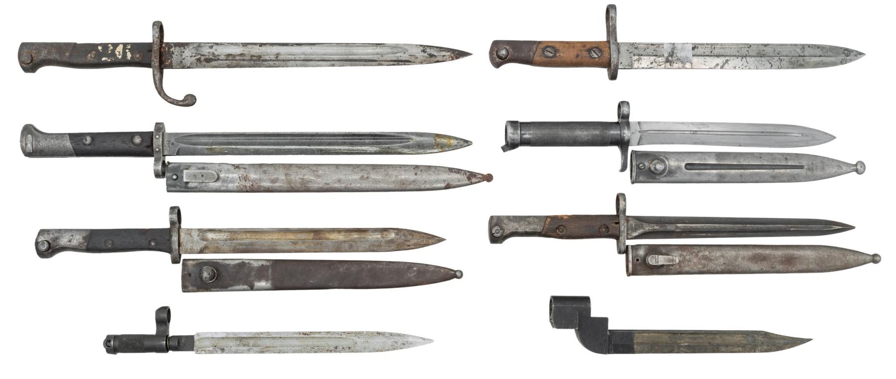 This lot consists of the following bayonets: 1) Swedish M96 Bayonet. Scabbard present that has different unit mark that bayonet. CONDITION: good with scattered wear, thinning & light oxidation. 2) Spanish 1893 Bayonet. Toldeo arsenal marked blade. No scabbard present. CONDITION: metal shows some sticker remnants, overall oxidation, fading to gray & some pitting. Handles show staining & handling wear. 3) SKS folding blade bayonet. Loose SKS blade bayonet assembly. CONDITION: metal shows overall oxidation & dried grease. 4) Czech VZ-24 Bayonet. Scabbard present. CONDITION: fair with overall fading to gray & scattered oxidation. Handles have a darkened appearance with gouges, chipping & dings. 5) British No. 9 Blade Bayonet. No scabbard present. CONDITION: metal shows scattered edge wear, fading & oxidation. 6) Brazilian M1908 Bayonet. Blade has Weyersberg marking. No scabbard present. Handles have old white paint rack number. CONDITION: metal shows overall oxidation, areas turning gray & some dried grease. Handles are dark with heavy handling wear. 7) Farsi marked Bayonet. Appears to be a Persian VZ-24 bayonet with Farsi marking on pommel & muzzle ring is wide. Scabbard present. CONDITION: fair with heavy finish loss, wear, dings, oxidation, light pitting & fading to gray. Grips show chipping. 8) Unmarked Bayonet. Appears to be a Turkish M1935 model. Scabbard present. CONDITION: fair with areas turning gray, scattered oxidation, dings, pitting grease staining & heavy wear to handles. (02-25774/MJC). $400-600 for lot.