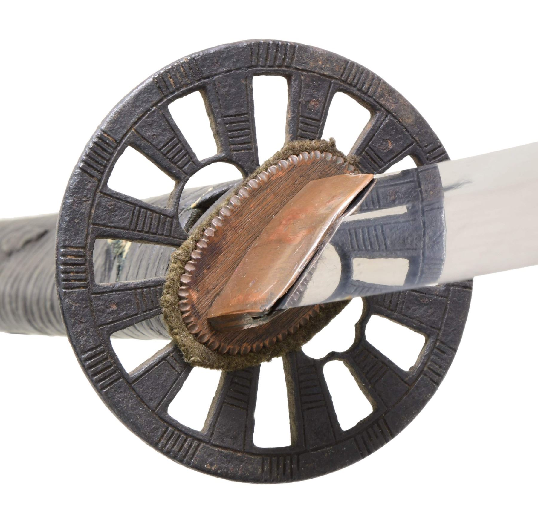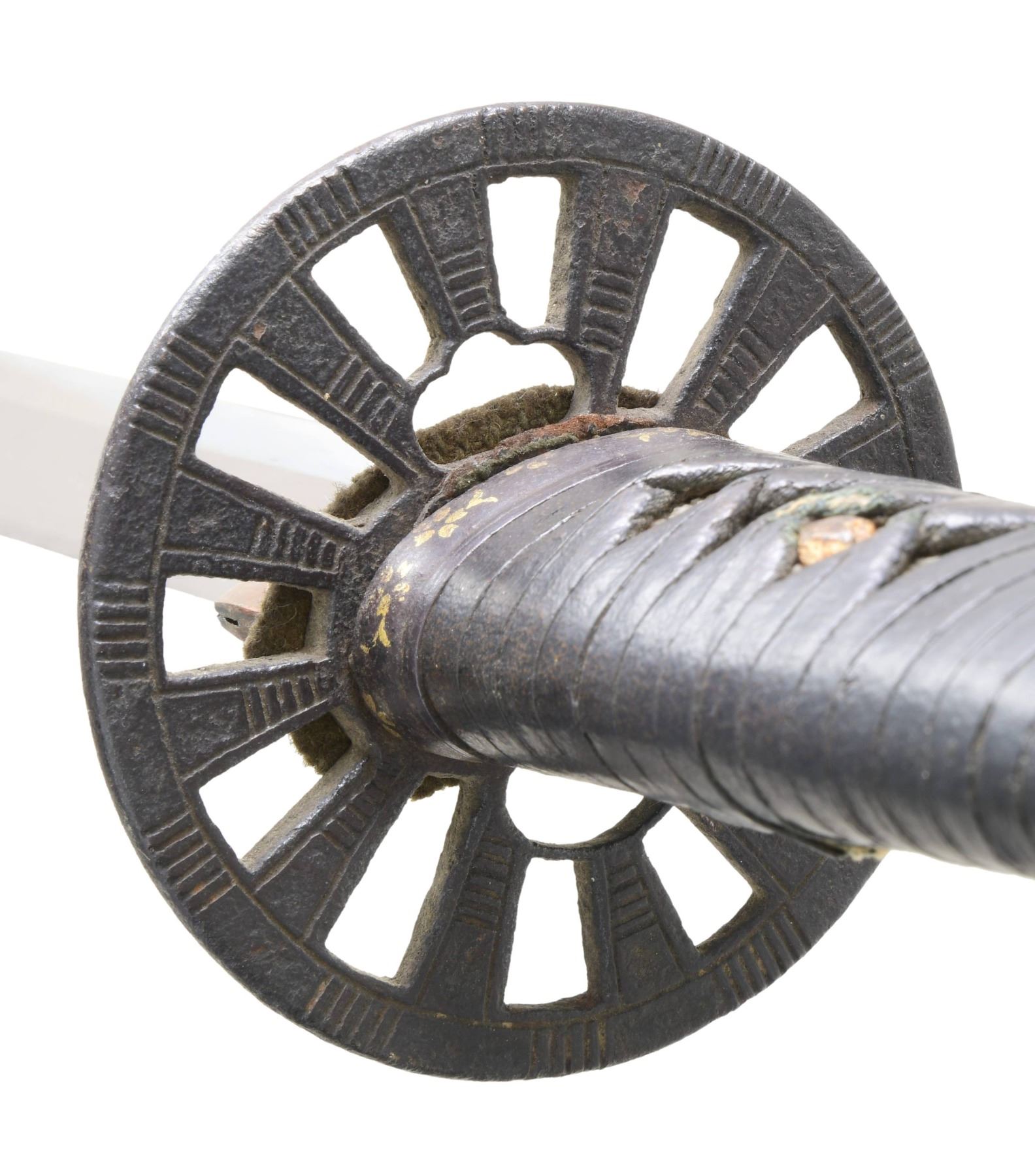 Overall length: 38 3/4". Blade length: 28 3/4". Blade has a straight hamon and a copper habaki. The nakago has two mekugi-ana and is not signed. There is one copper seppa and one leather seppa below the round, lineal-decorated, slotted iron tsuba, as well as one leather seppa above. The tsuka has a matching fuchi and kashira, and white same can be seen below the black leather tsuka-ito. No menuki are present. The saya is black-finished wood with an iron hanger. CONDITION: the blade has a good polish and shows a single forging flaw near the spine. The tsuba has a pleasing black finish with no heavy oxidation. The tsuka does show light wear. The saya has heavy wear with finish loss and is missing the koiguchi. (02-23598/BF). NON-GUN. $500-750.