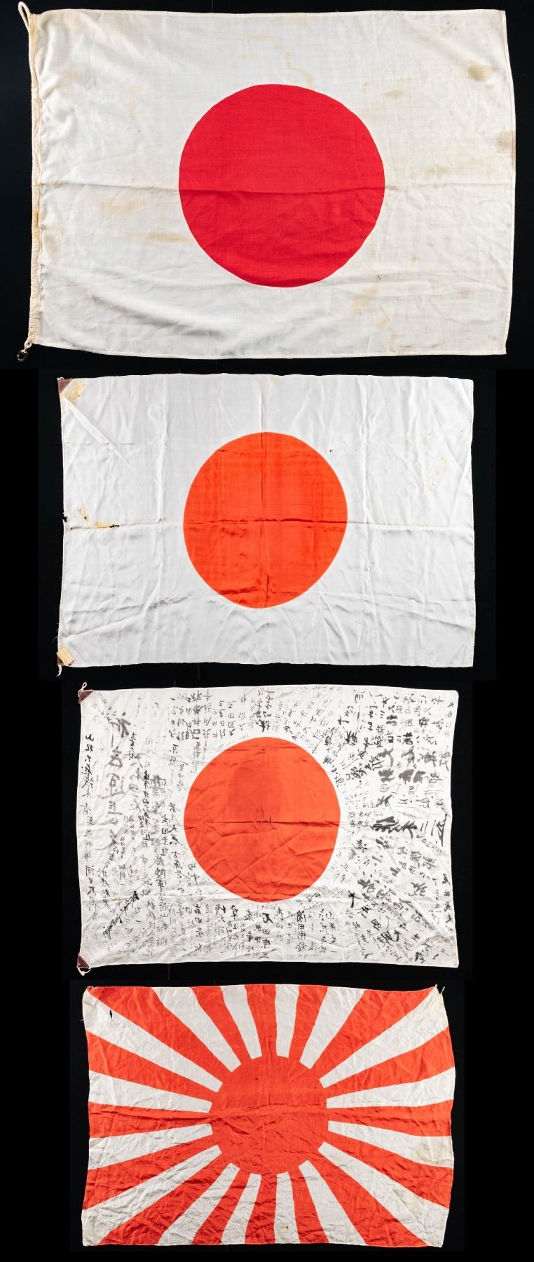 1) 28 x 38" silk Yosegaki Hinomaru "good luck" flag, this personal Japanese national flag was signed by numerous friends and fellow soldiers, leather reinforced corners of leading edge, very good overall, small tears near center, light staining. These are among the most popular souvenirs taken home by American GIs. 2) 26" x 37" silk "Rising Sun", worn & torn reinforced corners where flown, very good, small reductions. 3) 28" x 40", silk Hinomaru "meatball" Japanese National Flag, original 1.5" paper manufacturer's label attached next to one reinforcement at top hoist edge. Good overall, stains, and few reductions. 4) 32" x 46" Japanese Nisshoki (Sun-Mark Flag), wool bunting, sewn central red disc, sewn rope hoist with large brass swivel connectors, very good overall. CONDITION: good as described. (02-26113/JS). NON-GUN. $400-600.