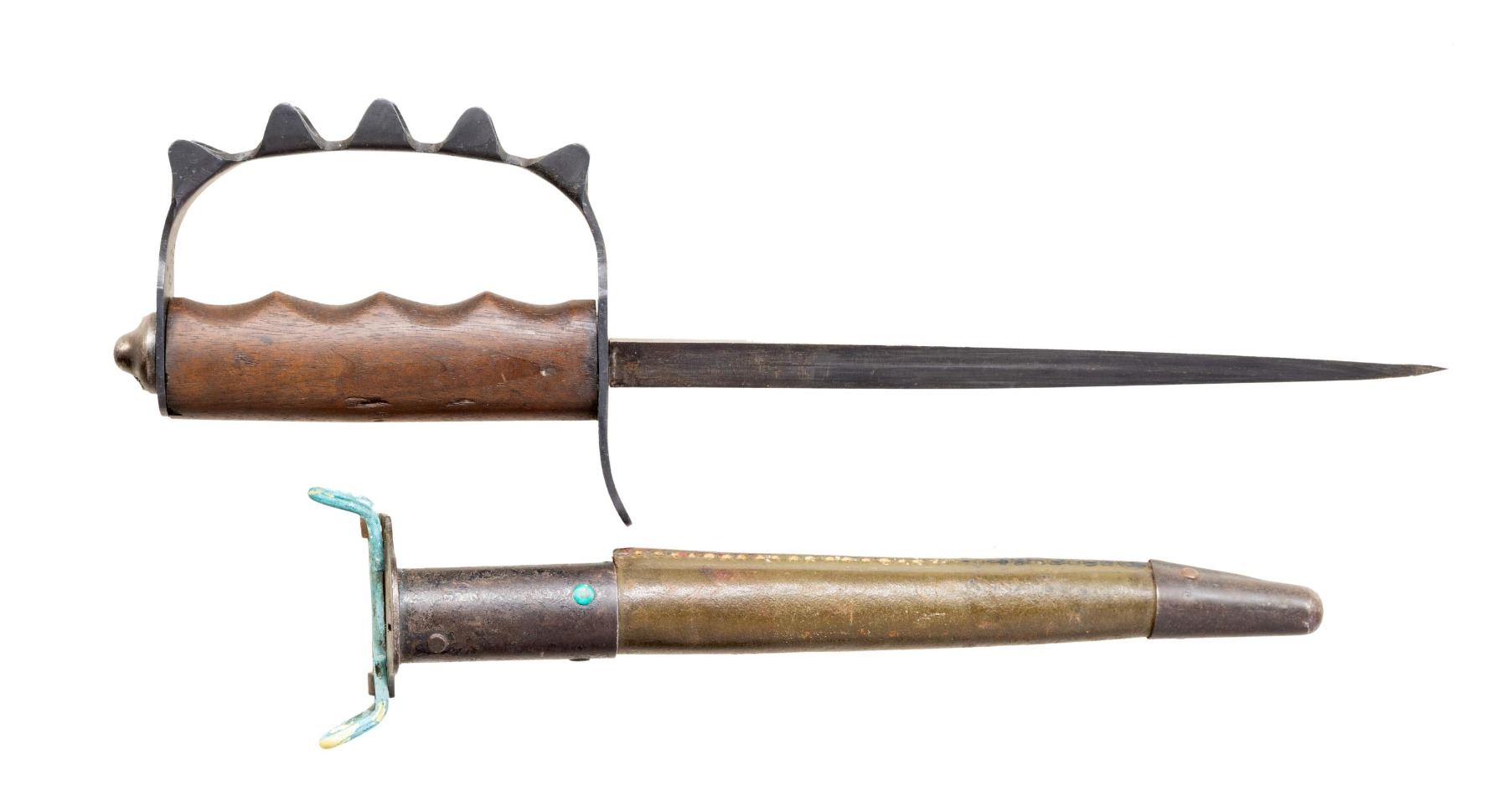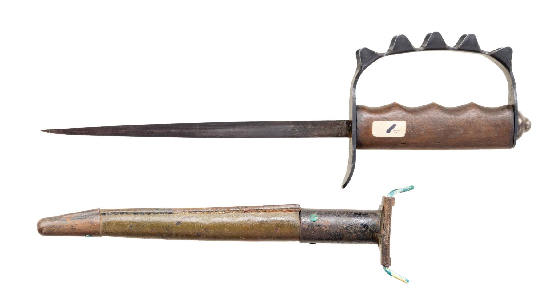 SHEATH. This knife is mfg. by Henri Disston and Sons & dated 1918, but had 1917 features. Overall: 14". Triangular 9" blade. Front of the "D" guard is marked "U.S. / H.D. & S. / 1918". The "D" guard has the raised pyramidal teeth & riveted pommel. Smooth finger groove walnut handle. Green leather sheath with steel tip & throat. CONDITION: blade shows good blue with wear from scabbard. Good wood finish. Guard has been reblued with prior pitting. Scabbard intact with flaking black paint & verdigris on hooks. [M349*1]. (02-25450/MD). NON-GUN. $700-900.
