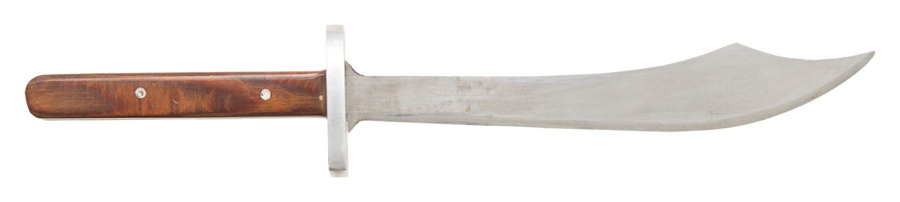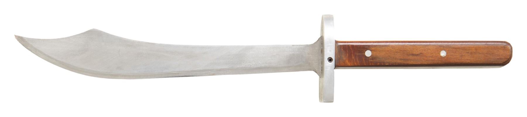An interesting side knife measuring 11 5/8" overall with a 7 1/4" blade. This knife was likely made in Vietnam and used by North Vietnamese or Viet Cong forces as it was reportedly brought back as a war trophy by a Vietnam vet. The knife has an Aluminum guard and a 2 piece wood grip that is secured by 2 pins on each side. No sheath. CONDITION: very light wear overall. (02-25892/BF). NON-GUN. $100-300.