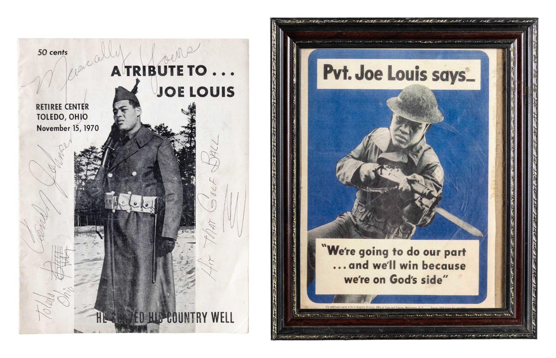 PHOTOGRAPHY & EPHEMERA. Several WW2 panoramic views including "tank Destroyer Batt'l, North Camp Hood, TX", "Colored Field Artillery School, Ft. Sill 1938", three Naval Training Stations for black sailors 1943-1944. Three large framed color portraits of black WW2 Gis, one with sweetheart, large framed WW1 black GI. Korean War scrap book containing about 40 tipped in photos. About a dozen photos of black Gis, several of black women in uniform, 1943-1944 "I Can Tell The World-Negro Army Chorus in England" with several filled autograph pages. Also included are 3 Civil War black related documents, and 2 Joe Louis illustrated flyers, and more. CONDITION: mostly good, few photos damaged. (02-26442-4/JS). NON-GUN. $400-800.