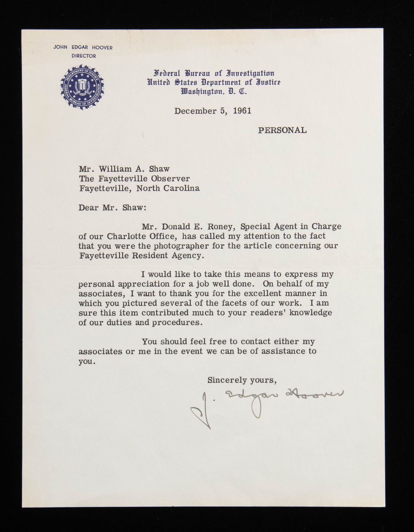 Original typed letter dated December 5, 1961, on official Federal Bureau of Investigation, United States Department of Justice letterhead, addressed to Mr. William Shaw of Fayetteville, NC. The letter, signed in ink by FBI Director J. Edgar Hoover, acknowledges his regard of job well done. This is fine example of FBI correspondence, bearing distinctive "J. Edgar Hoover" signature. 9.5" x 7". CONDITION: fine, minor light fading. (02-26110/JS). NON-GUN. $100-200.