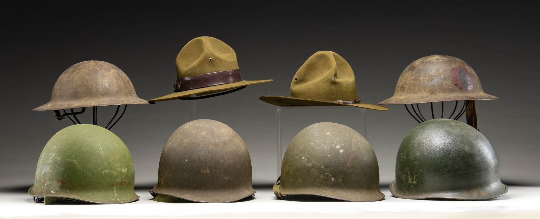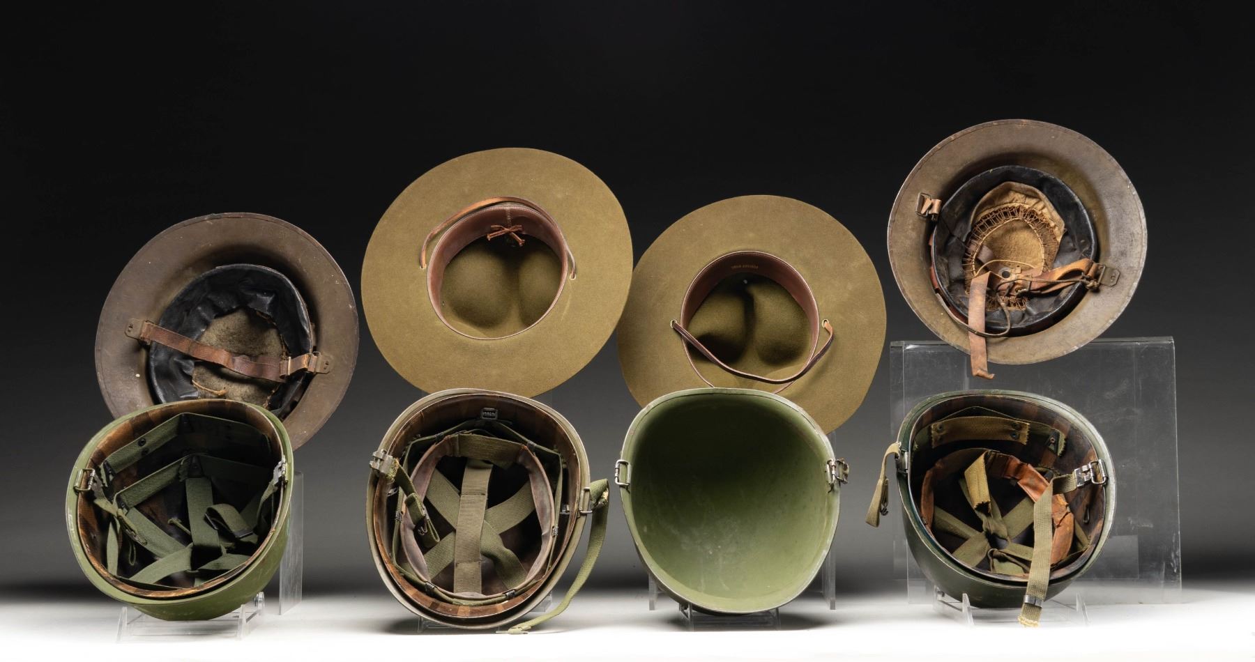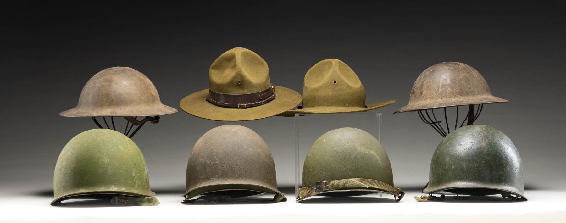 Lot 1683 2 M1917 & 2 M1 HELMETS ALONG WITH 2 BSA HATS.
