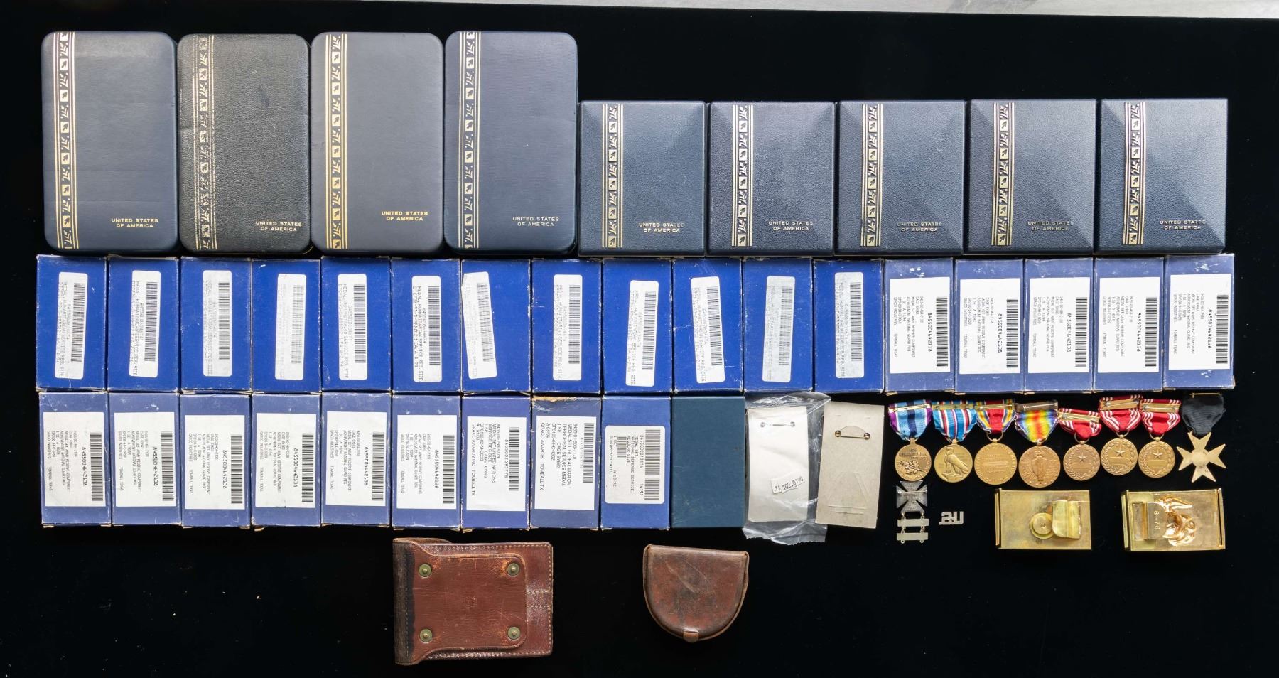 Lot of assorted U.S. service medals, including: 1) x2 U.S. Meritorious Service medals in blue leatherette cases. 2) x1 U.S. Legion of Merit medal in blue leatherette case. 3) x1 U.S. Secretary of Defense Outstanding Public Service medal set (minus ribbon bar) in case. 4) x3 U.S. Military Merit medals in cases (x1 set missing ribbon bar). 5) x2 U.S. Army Military Achievement medals in cases. 6) x11 U.S. Army National Guard achievement medals in boxes. 7) x12 U.S. Humanitarian service medals in boxes. 8) x1 U.S. National Defense service medal in box. 9) x1 U.S. Global War on Terrorism medal in box. 10) x1 U.S. United Nations service medal in box. 11) x1 Republic of Vietnam service medal in box. 12) x3 loose U.S. Army Good Conduct medals. 13) x2 loose Humanitarian Service medals. 14) x1 U.S. Armed Forces Service medal (sealed in plastic packaging). 15) x1 loose American Campaign medal. 16) x1 loose U.S. World War I Victory medal. 17) x1 U.S. World War II Victory medal. 18) x1 U.S. Army Marksman badge with pistol and rifle qualification clasps. 19) x1 loose "U.S." uniform collar insignia. 20) x2 U.S.M.C. polished brass belt buckles. 21) x1 U.S. brown leather 2-cell M1911 pouch. Rear of belt loop is marked "US", followed by "J.Q.M.D./ 1940/ E.N.S.". 22) x1 brown leather (apparent) compass pouch. Interior is marked "S.O.U.P. 1593.". Lid is fitted with a German WWII Black Wound badge. 23) x1 loose American Freemasons Knights of Malta medal. CONDITION: medals are good to very good, with some exhibiting some age related discoloration and wear to the ribbon. Boxes show varying degrees of wear from handling and storage, but remain sturdy and serviceable. M1911 mag. pouch shows some spots of light age related cracking and mild crazing, but otherwise remains sound. (02-24208/MLW). NON-GUN. $400-700.