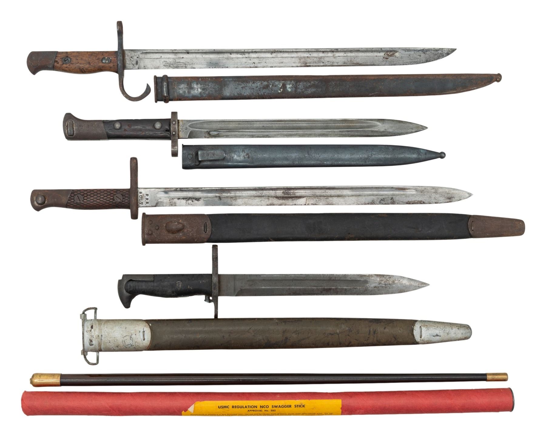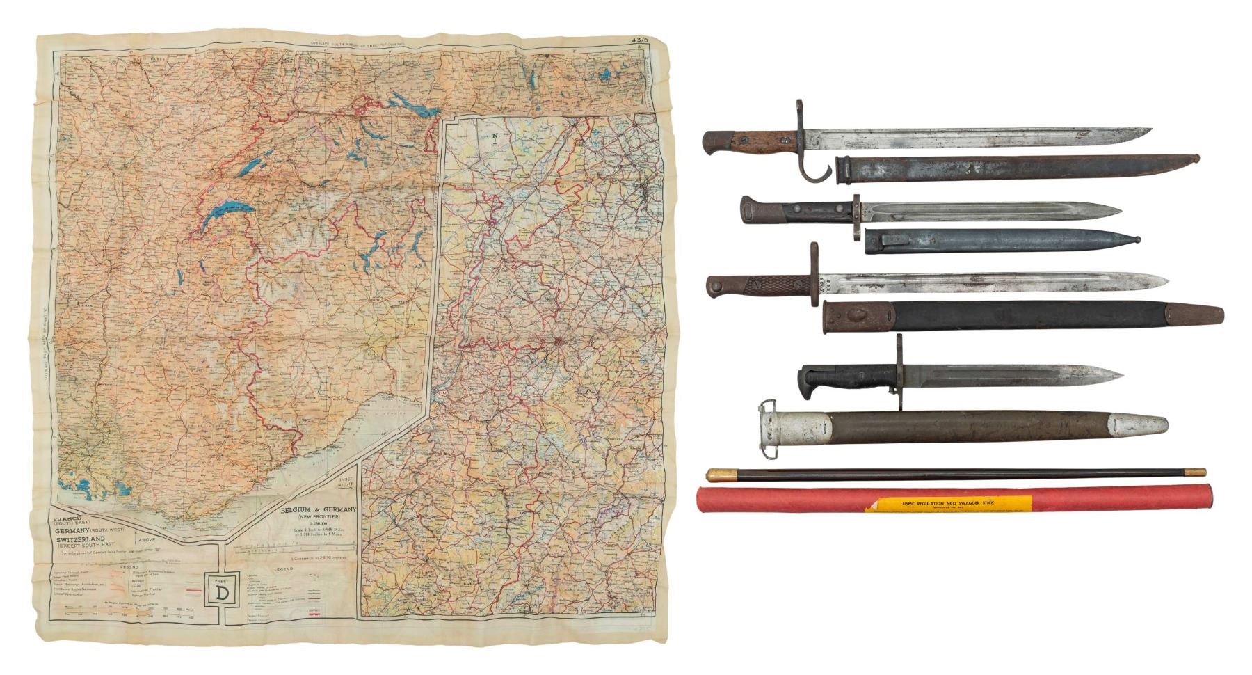 Lot 1686 4 BAYONETS, SWAGGER STICK & SILK MAP.
