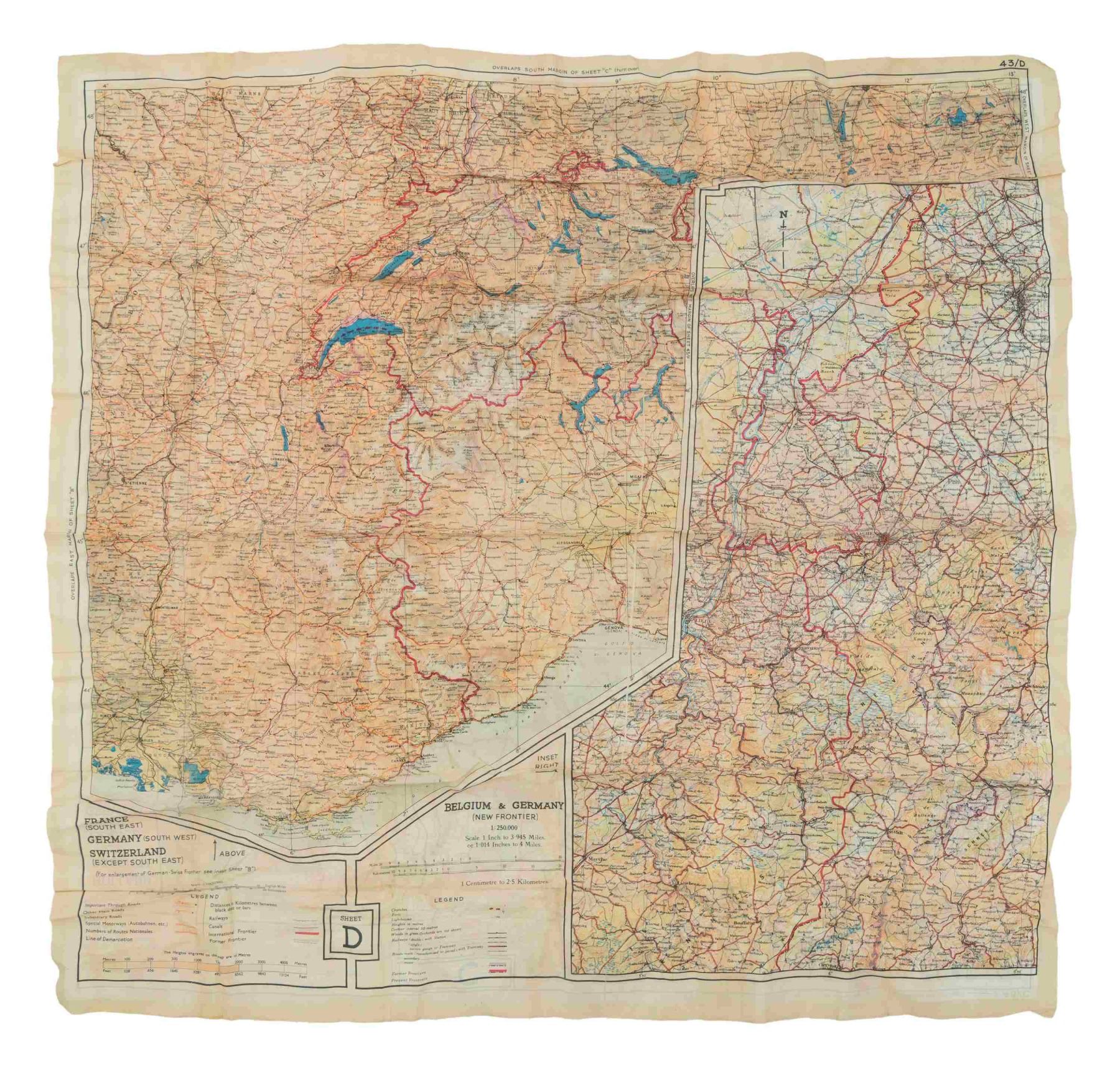 6) WWII Silk map of Belgian, Holland, along with portions of France & Germany. Contained in medal case. Appears in good condition showing light wear & staining. (02-24211/MD). $300-500.