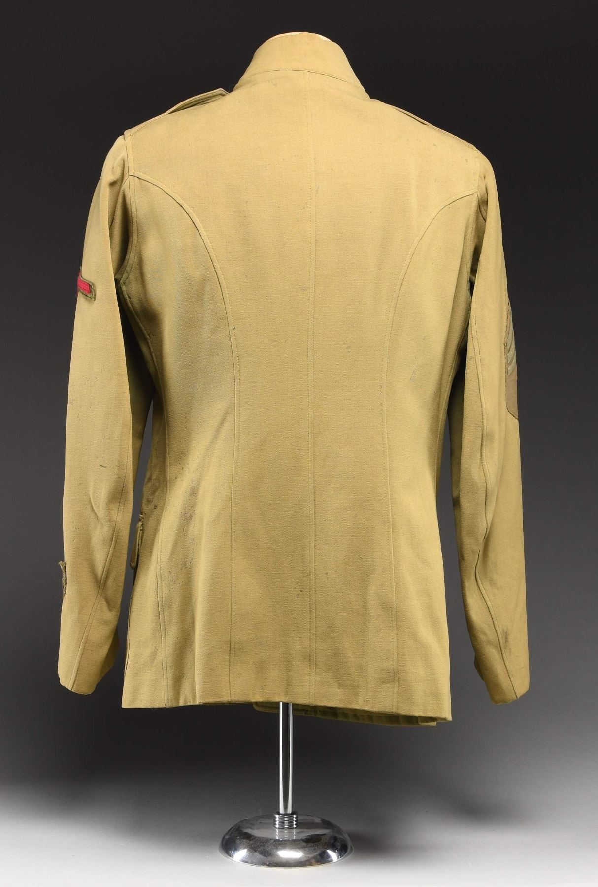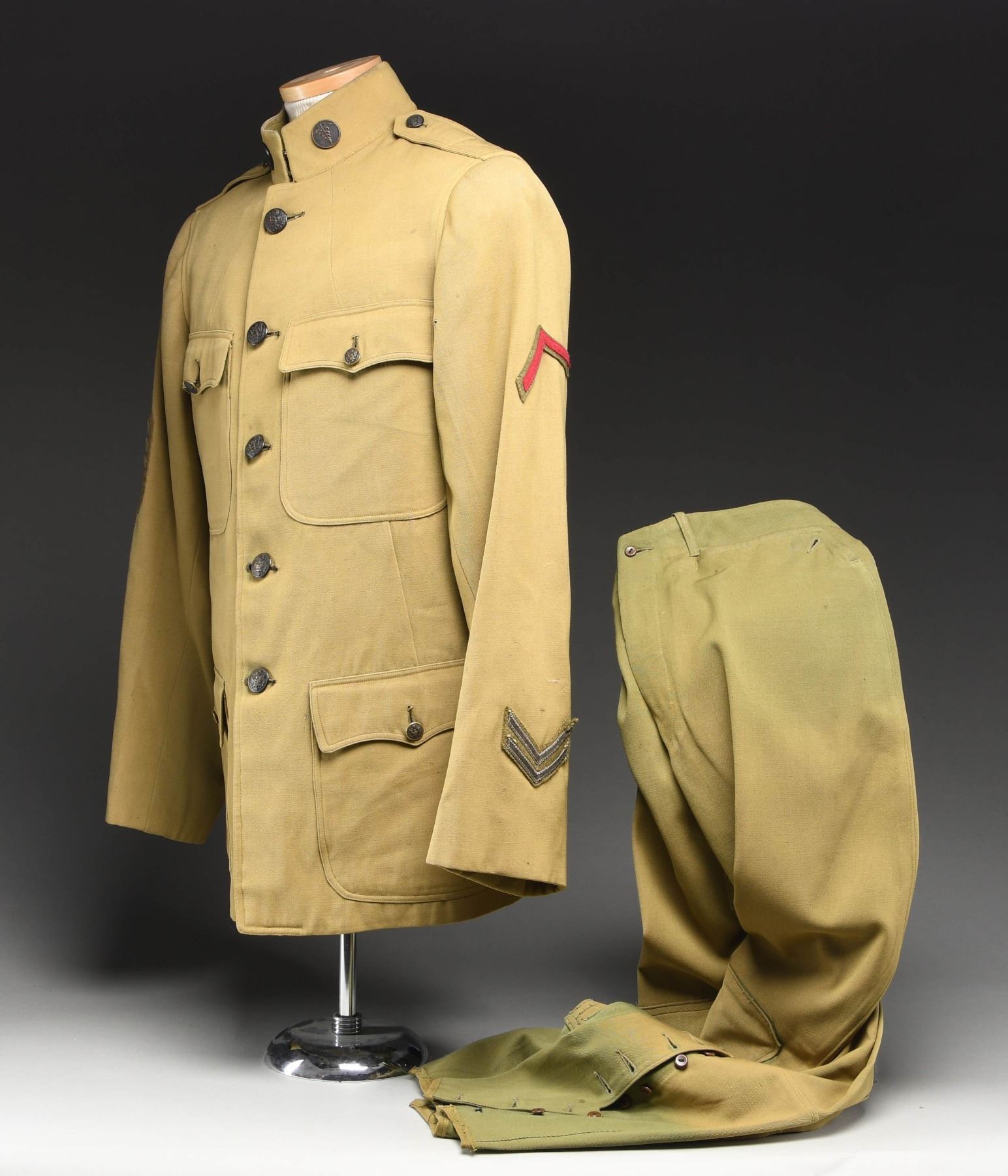 This uniform coat and pants is for a sergeant in the Medical Corps and was summer issue during WWI. The tunic has the correct buttons and collar disks along with a single stripe for a Medical Sergeant. The left sleeve has 2 overseas chevrons and a red discharge chevron. The pants are of mounted style with a reinforced seat and button calves. CONDITION: uniform is a bit faded but remains solid and undamaged. (02-24474/BF). NON-GUN. $200-300.