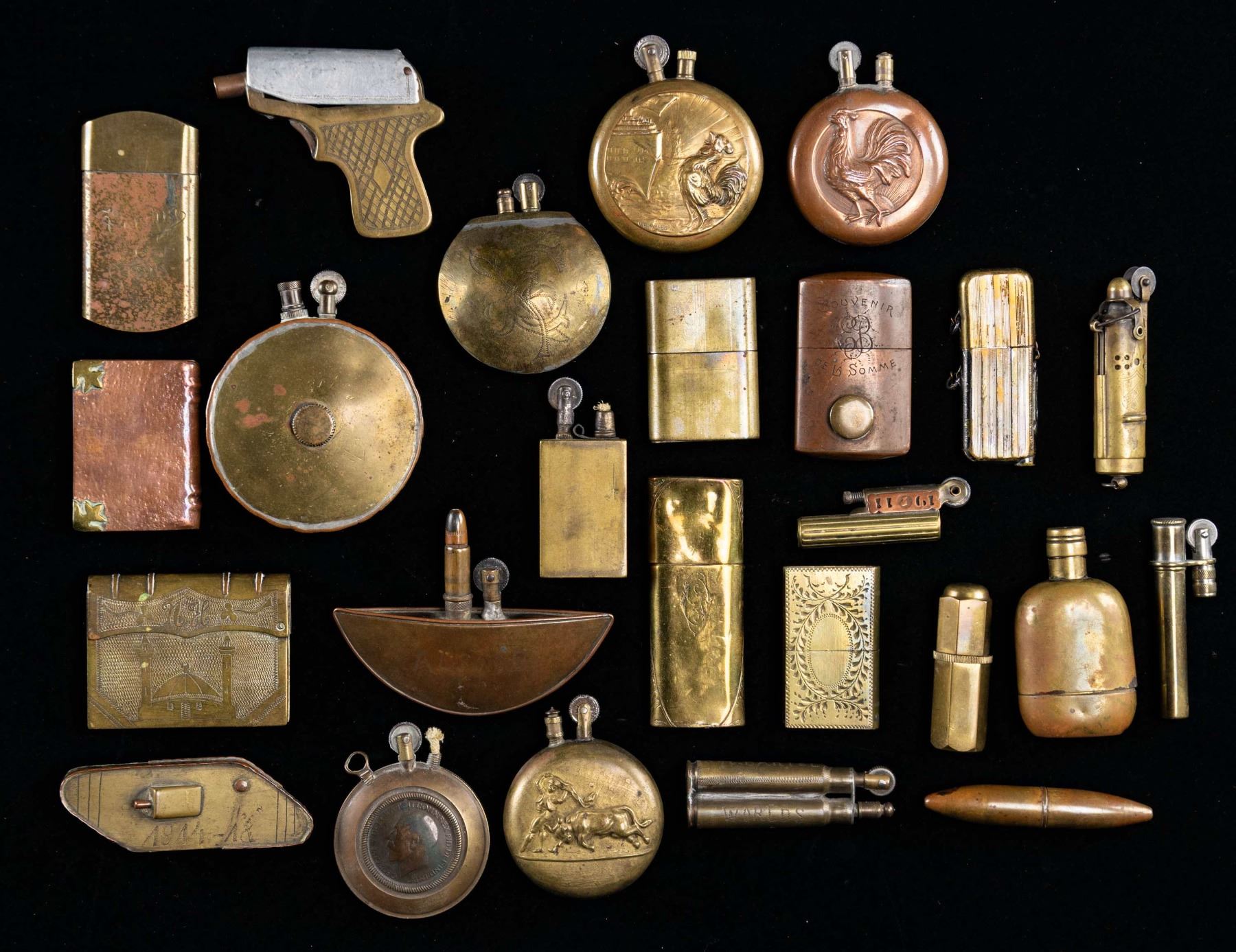 Eclectic group of different shapes and designs, various battle sites engraved, some made from as trench art from discarded munitions. CONDITION: good to very good overall, most appear to function. PROVENANCE: Estate Collection of Compton LaBauve Jr. (02-26472-1/JS). NON-GUN. $1,000-2,000.