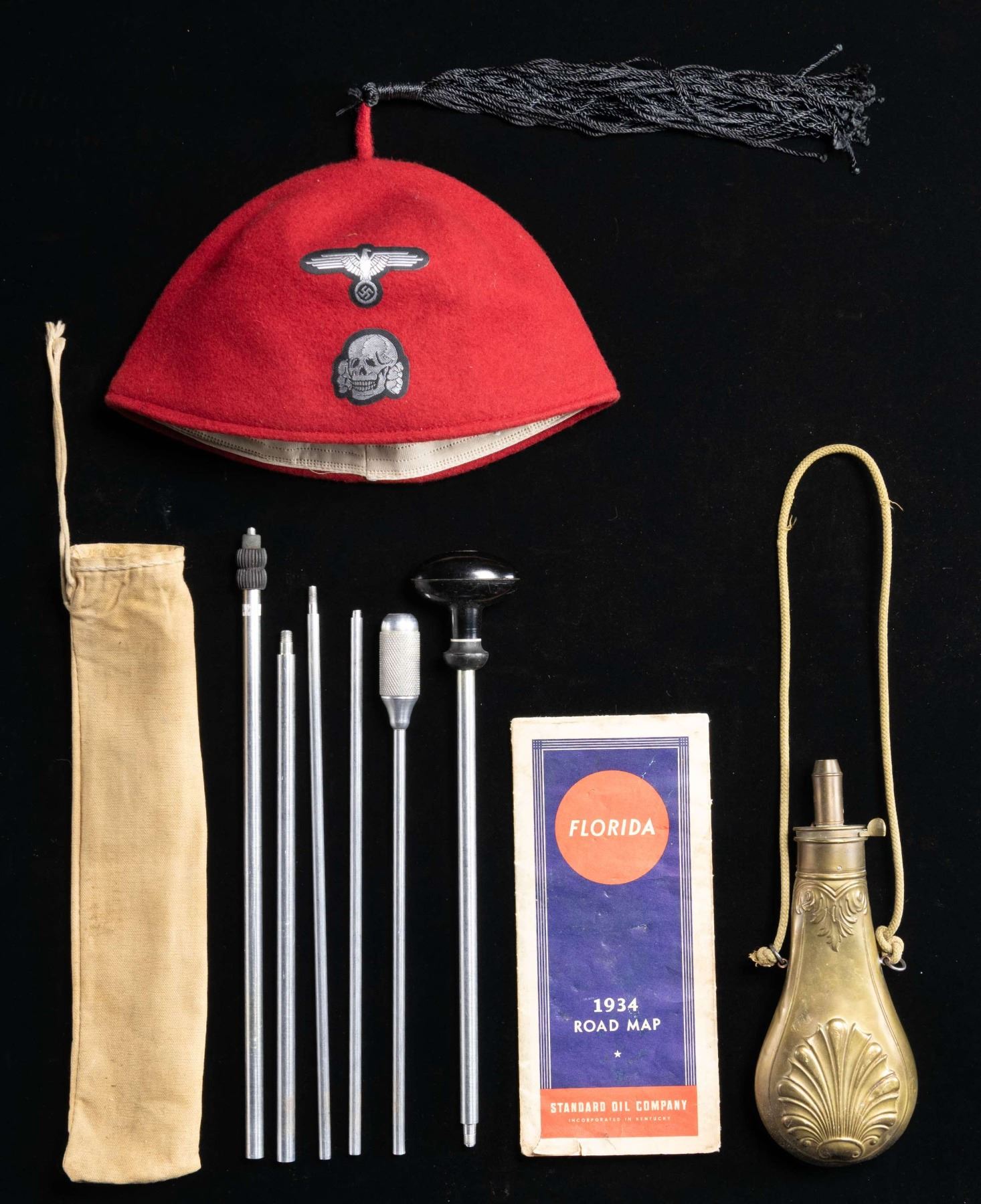 This mixed lot includes 1 Standard Oil roadmap of Florida dated 1934, 1 large brass powder flask with heavy dents, 1 cleaning rod kit in a canvas bag stamped "30 C.A.", 1 reproduction WWII style German SS fez in red, 1 chauffeur badge from Oregon dated 1913, and 1 chauffeur badge from Oregon dated 1914. CONDITION: all items show light wear. The map is a bit tattered and stained. (02-25417/BF). NON-GUN. $150-300.