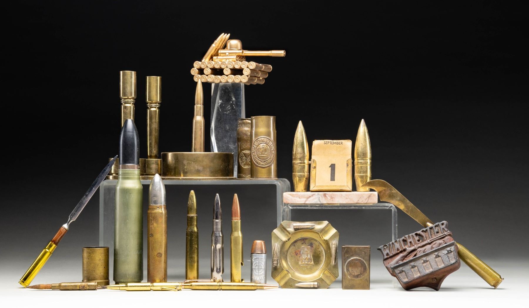 Lot of primarily WWI / WWII era trench art, including: 1) WWII era ash tray fashioned from a 105mm M14 Type I training casing, fitted with an inert .50 BMG rnd. in the center of the tray. Base of 105mm rd. is double stamped "105MM M14 TYPE I" above lot information and production year of 1943". 2) Pair of brass candle sticks fashioned from USN Bofors 40mm MK 1 bases, .50 BMG cases, and an unidentified (slightly larger than .50 BMG) cartridge cases. Underside of Bofors 40mm bases are dated "7-42". 3) Inert .50 BMG rnd. fitted with a handmade brass blade on the projectile that loosely resembles a scimitar. Side of cartridge case is engraved "NEW GUINEA 1944". 3) .50 BMG cartridge case fashioned into a lighter with a faux brass projectile cover. Lighter is mounted on an acrylic base. 4) x2 Contemporary .50 BMG cartridge casings fashioned into bottle openers. 5) WWI / WWII era trench art ash tray. Tray is constructed of brass, featuring 4 (apparent) 8mm Mauser projectiles around the circumference. Center of tray is embossed with a brass depiction of the Reims Cathedral. 6) U.S. WWI trench art pendant fashioned from a .30-06 Springfield cartridge. A ring has been installed in the primer location, with a U.S. style eagle embossed on the front. Cartridge is fitted with an apparent period wood projectile. 7) x1 French 37-85 37mm Hotchkiss trench art cartridge cases. x1 casing (dated "4.18") embellished with a brass German "GOTT MIT UNS" (GOD WITH US) plate on the front, the other casing (dated "1.17") heavily embellished with texturing and a cross, with "FRANCE/ SUPPLY/ TRA" above a U.S. 7th Infantry Division insignia. 8) x1 Federal Laboratories approx. 37mm brass cartridge. Base is marked "FEBERAL LABORATORIES INC." above "PITTSBURGH. PA. U.S.A.". 9) GAU-8 Avenger 30mm API PGU-A/B dummy rd. Casing exhibits faint partially legible text on the side, with additional markings present on the underside of the base. Projectile exhibits a black enamel type finish and is marked "*HVM-15-44 55 30MM-322 *" at the neck of the casing. 10) WWII era trench art consisting of a German card calendar 2 projectiles (measuring 25mm) mounted on a small slab of granite. Calendar is missing various cards. 11) Eveready Daylo "bullet" flashlight. Brass construction with polished metal cap. 12) Hunter Bullet Lighter. Polished metal body with hinged brass cap. 13) Unidentified trench art consisting of a folder brass panel, featuring a "REPUBLIQUE" and "FRANCAISE" medallion on one side and "NAPOLEON III EMPEREUR" 1862 dated medallion on the obverse side. 14) Brass tank model comprised of primarily 7.62x51mm NATO cartridge cases. 15) Custom letter opener with handle comprised of a brass Weatherby .460 Magnum casing. Letter opener blade is mounted on a section of wood, which protrudes from the neck of the casing. 16) Custom cross pen comprised of 2 brass cartridge cases. 17) Custom faux pen comprised of 2 South African 7.62x51mm NATO casings. Non-function brass tip. 18) Winchester cast iron wall mounted match holder. CONDITION: metal components exhibit varying degrees of age related discoloration and handling marks, with all appearing to remain sound. PROVENANCE: Norman Olliff Estate. (02-25717/MLW). NON-GUN. $100-200.