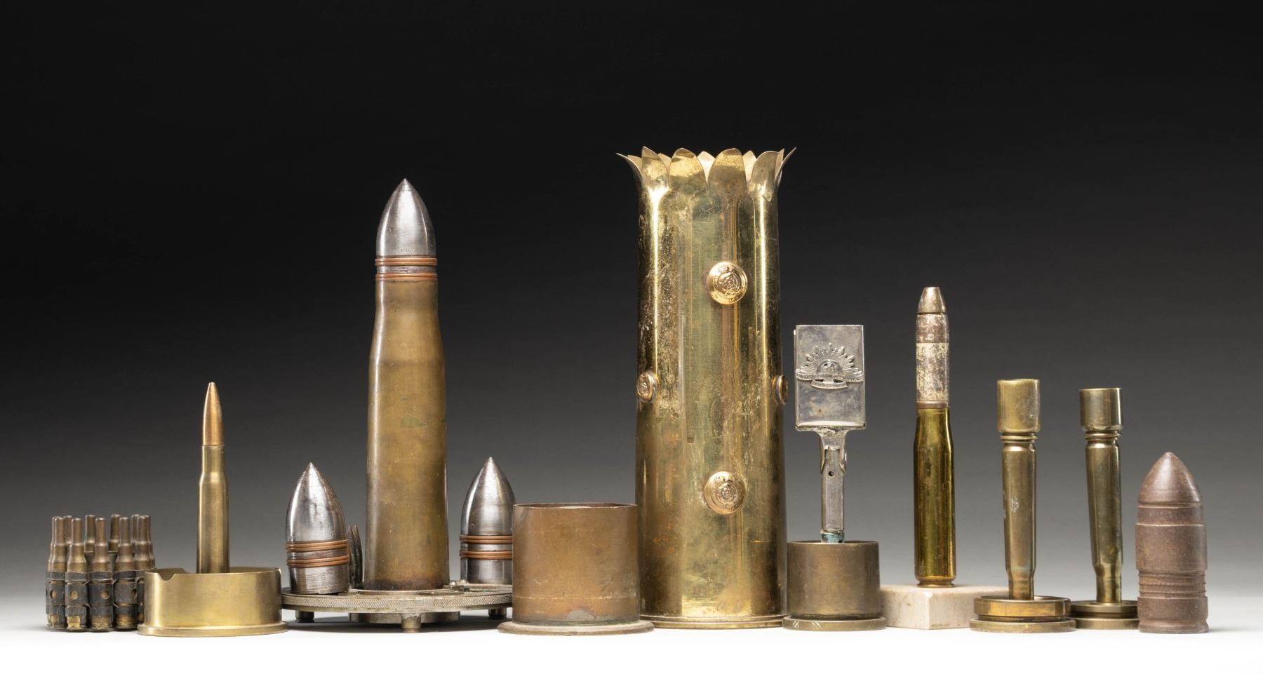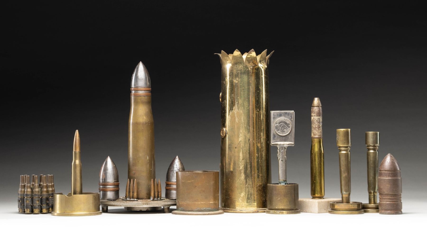 ONE AND TWO AND THE COLD WAR ERA. No.1: WW1 British 18 PDR shell casing with flared top with four added floral rosettes and shallow punched flaming bomb. Casing has been polished, returning to patina. / No.2: WW2 Australian Napkin Holder fashioned from the base of a 40mm shell. The holder appears to be made from two belt buckles and plated with a silver coating. One side has the Australian 1943 penny and the reverse has the crown ("Australian Commonwealth Military Forces"). / No.3: Pair of Brass Candlesticks fabricated from 40mm shell bases and using an inverted 50 cal. machine gun case. / No.4: Ashtray fashioned from 57mm M23A2 shell casing with an inert 50 cal. machine gun cartridge mounted in the center. / No.5: Ashtray fashioned from an approximately 57mm shell. / No.6: Interesting German decorative display fashioned from a 37mm shell, mounted on a salvaged steel range-plate which is marked "RICHTUNG / GESCH". The central shell is flanked by two inert projectiles. / No.7: U.S. 20mm shell and projectile mounted on a base which appears to be marble. / No.8: Inert steel 40mm projectile marked only with "75" on the base. / No.8: Vietnam Era Ashtray fabricated from a 40mm M203 shell. Encircled with a belt of 7.62 NATO blank fired casings. CONDITION: items show light wear with patina and handling marks with appearance of light cleaning. (02-25740/RW). NON-GUN. $100-300.