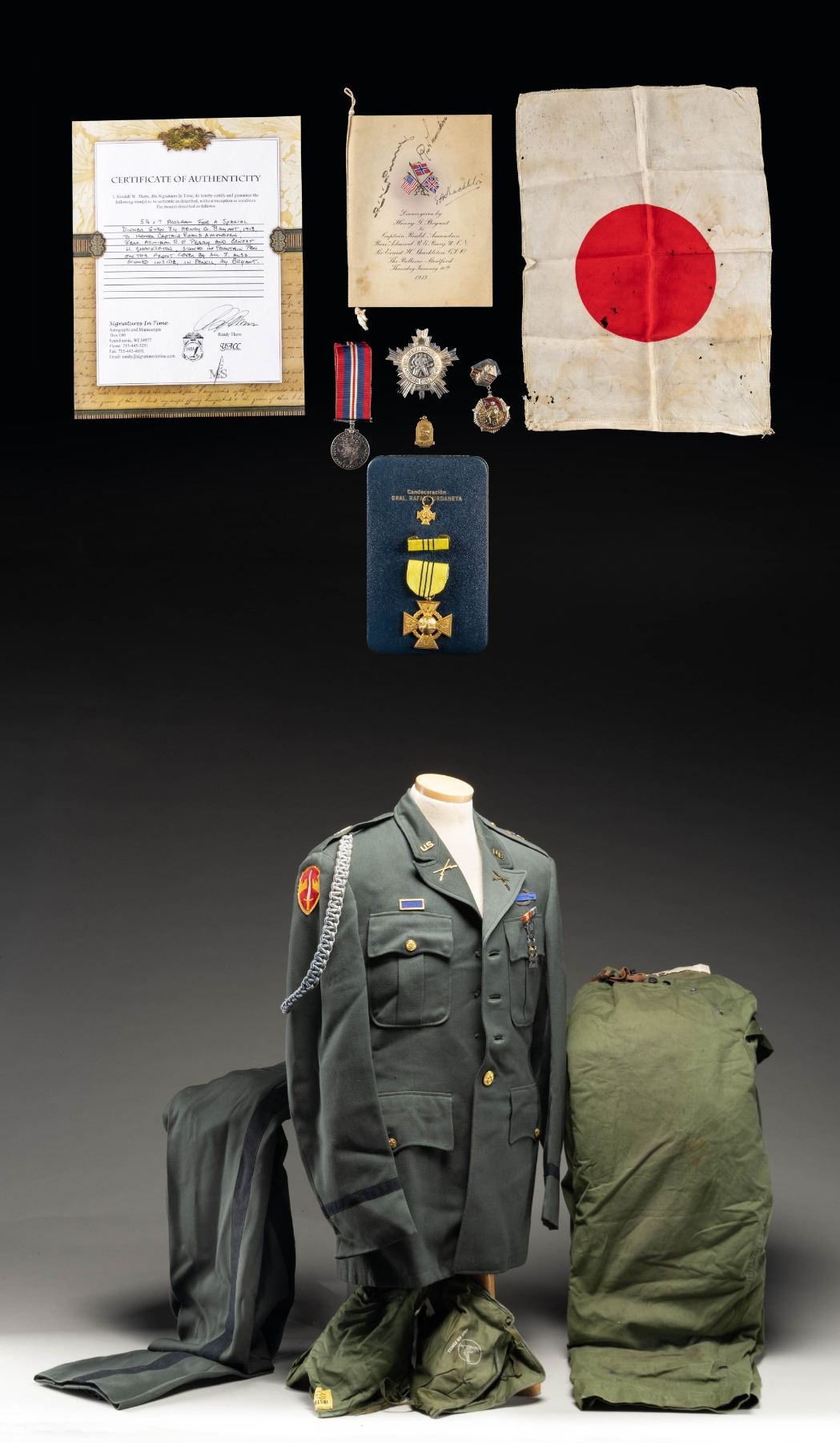 This lot consists of the following militaria: 1) US Army Blouse. Blouse has 1st Army patch, 169th Infantry insignia, combat infantryman badge, two ribbons, marksmanship badges with pistol, rifle, carbine & machine gun. Blouse is missing most of its front buttons. Also present are a pair of corresponding trousers. 2) Small WW2 Japanese flag that shows staining. 3) Venezuelan Military Order of General Rafael Urdaneta Medal. Medal appears to be a lower class one, Ribbon, small medal & presentation case all present. 4) Yugoslavian Communist Medal. Medal to commemorate service in WW2 including partisans against the Germans. 5) British George VI Medal. WW2 Service Medal with ribbon. 6) WW2 US Army Air Force Boot Inserts. 7) Pair of unknown green military trousers. 8) A signed 1913 dated dinner invitation with signatures form Ernest Shackleton & Admiral R.E. Peary. CONDITION: items show varying degrees of wear & staining. (02-24212/MJC). $400-700.