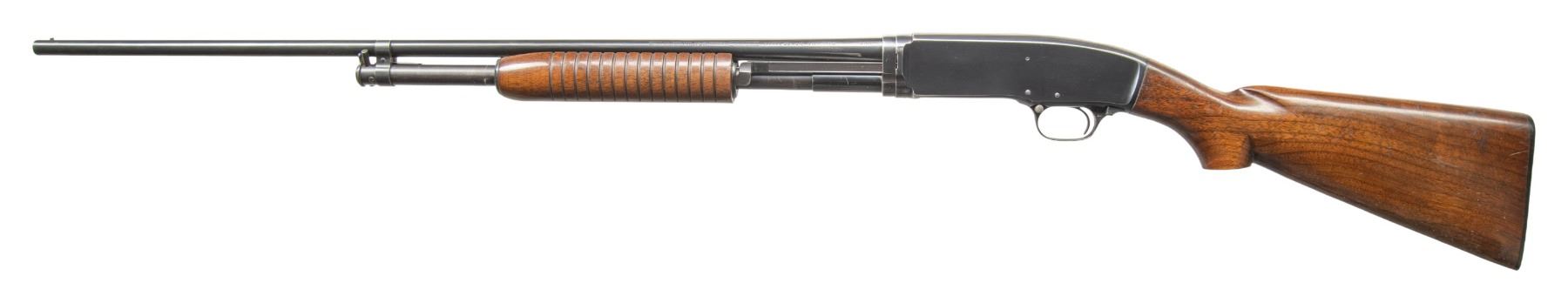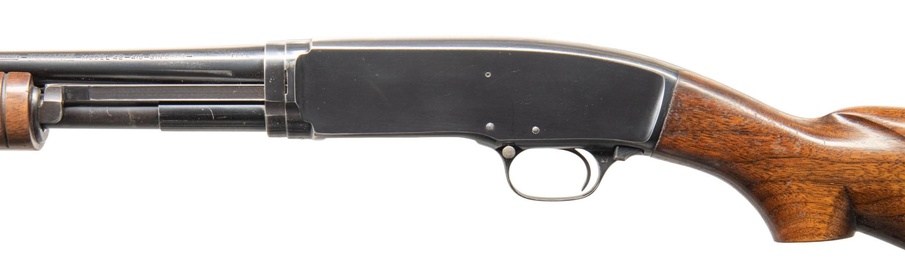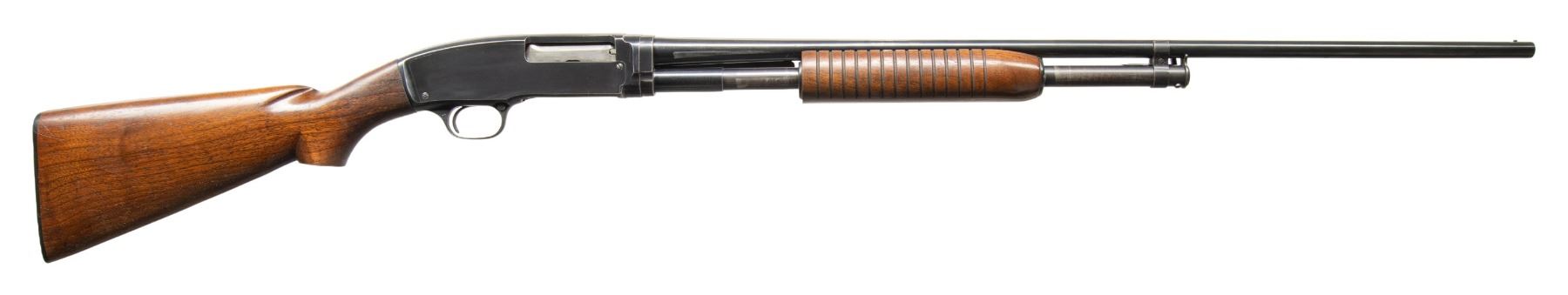 Cal. 410. 3". S# 86193. Bbl. 28" plain with steel bead. Full choke. Flat bottom grooved forearm and pistol grip walnut stock and original buttplate. Mfg. 1950. CONDITION: over 80% blue showing carry and slide wear. Wood shows moderate finish wear with scattered scratches and small marks. Sound action. Good bright bore. PROVENANCE: Estate of Lloyd Robinson. (25-6645/DS). CURIO. $800-1,200.