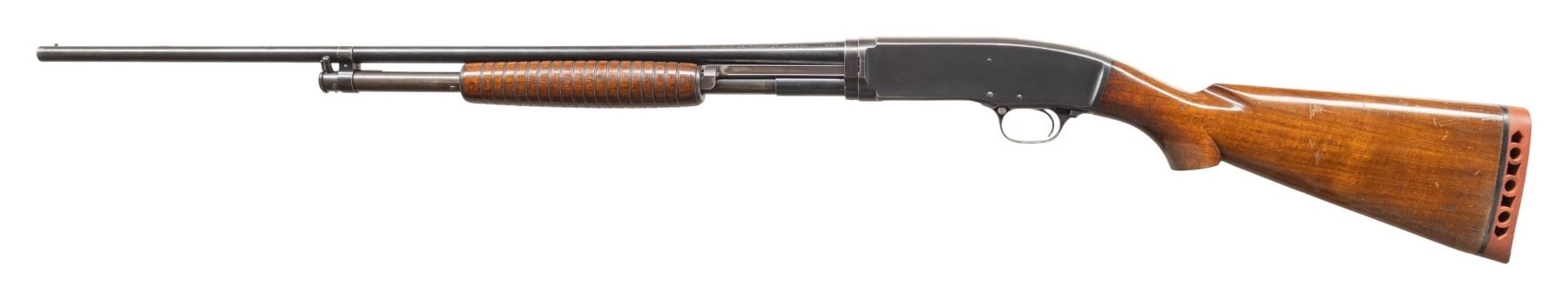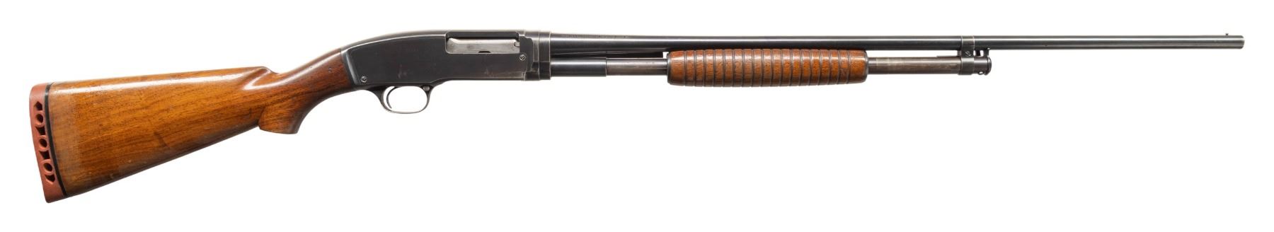 Cal. 410. 3". S# 17170. Bbl. 26" plain with steel bead and MOD choke. Small round grooved forearm and pistol grip walnut stock. LOP: shortened to 13 5/8" over an aftermarket redhead pad. Mfg. 1935. CONDITION: 80% lightly worn blue showing carry and edge wear with small spots of pitting. Wood shows finish wear with scattered scratches and marks. Stock shows sanding damage from fitting the aftermarket pad. Sound mechanics. Good bright bore. PROVENANCE: Estate of Lloyd Robinson. (25-6649/DS). CURIO. $800-1,200.