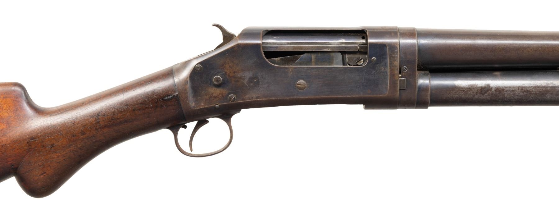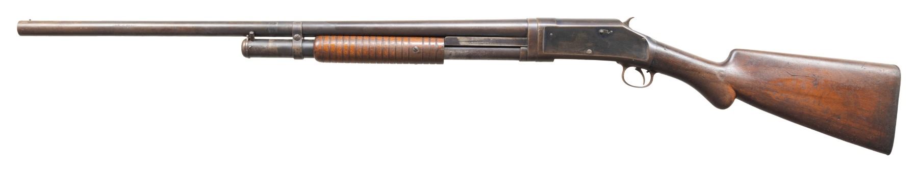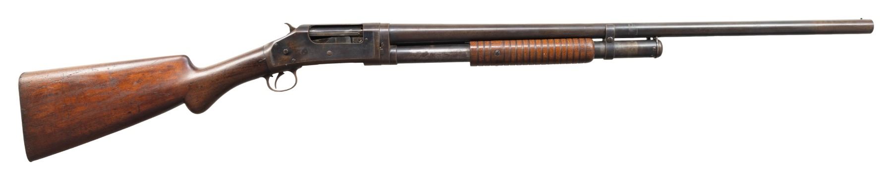 Cal. 12ga, 2 5/8". S# C138175. Bbl 28" plain with fixed full choke and steel bead. Small round three screw forearm and round knob pistol grip walnut stock with steel buttplate. Mfg. 1901. CONDITION: bbl and action retain 60% dull worn blue showing spots of surface corrosion and light pitting. Wood has dark worn finish showing scratches, marks, dents and mildew spots. Action shows wear, assembly and disassembly is extremely stiff. Bore shows spots of pitting. (25-1342/DS). CURIO. $250-400.