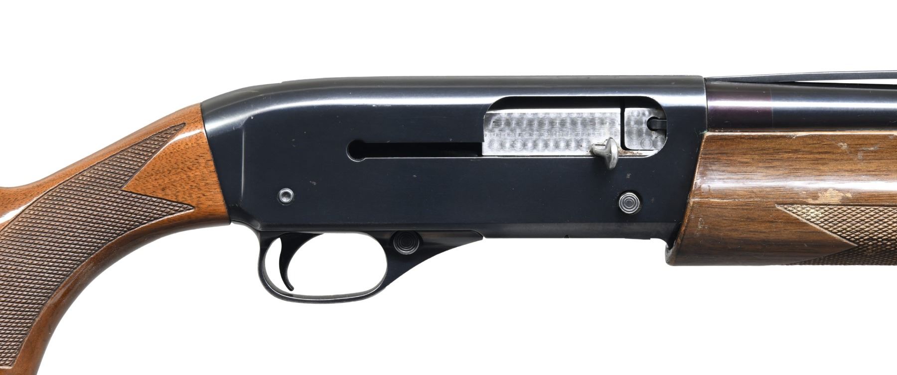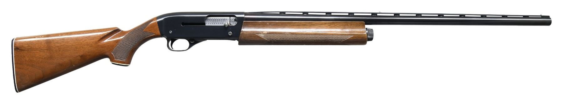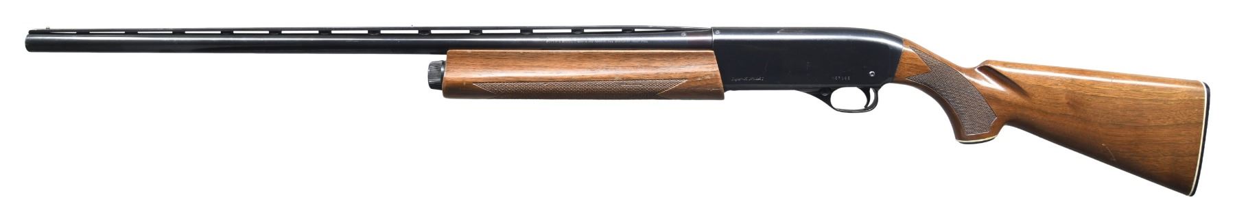 Cal. 12 ga. 2 3/4". S# M57365. Bbl. 28" vent rib w/ Mod choke. Steel front & mid beads. Jeweled bolt & carrier. Forearm & capped pistol grip stock of gloss finished walnut w/ cut checkering, original buttplate & white line spacers. Mfg. 1974-1981. CONDITION: over 80% blue showing carry wear & scratches. Wood has lightly worn finish showing numerous scratches & marks. Forearm is cracked & glued along rear edges. Bore has a dull appearance. (24-3114/S). MODERN. $300-400.