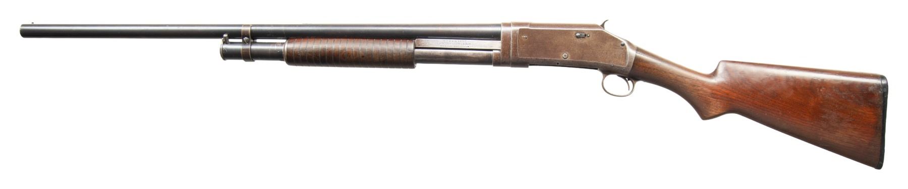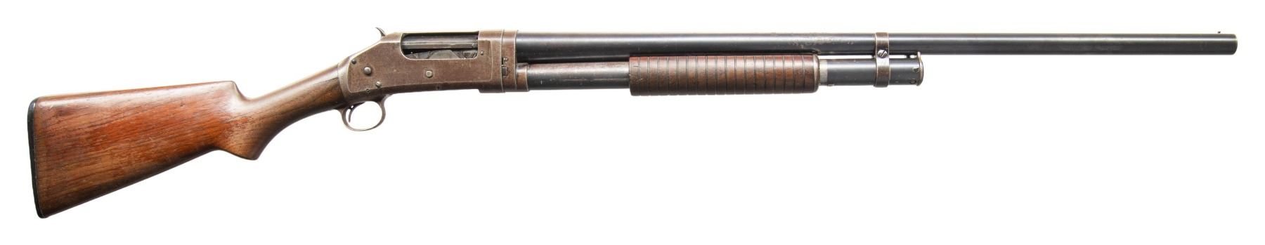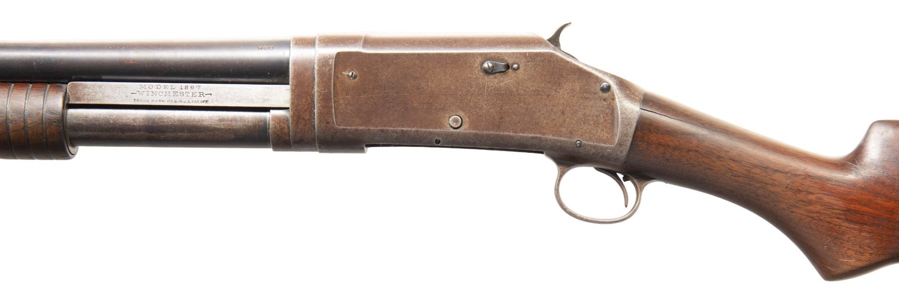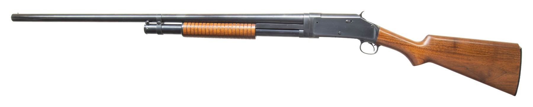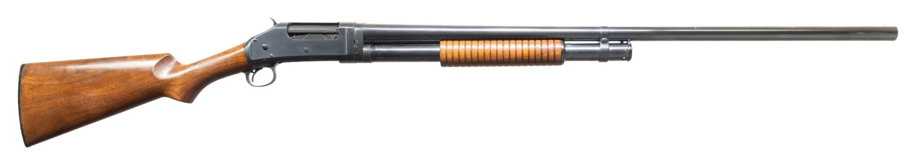 SHOTGUNS. 1) Cal. 12 GA. S# E523544. Bbl. 28". Model 1897 pump action shotgun mfg. by Winchester in 1914. Top of the bbl. is marked with Winchester's 2-line mfg. and patent information, followed by "12 GA.", with a "MOD" choke marking stamped on the left. Metal components exhibit a blue finish overall. Grooved wood pump with plain wood pistol grip buttstock and checkered black hard rubber Winchester buttplate. Brass bead front sight. Bbl. matches the receiver. CONDTION: receiver retains fair amounts of its original blue finish, exhibiting wear and thinning fading to gray patina, scattered superficial handling marks, as well as consistent light to mild surface oxidation overall. Bbl. retains large amounts of its original blue finish, exhibiting consistent light surface oxidation, with scattered patches of mild oxidation. Bore exhibits a consistent scattering of mild to moderate pitting. Proper manual mechanics. Wood furniture shows scattered marks and impressions from handling and storage, with the buttstock exhibiting a crack on either side of the wrist that stems from the receiver. (25-4752/MLW). 2) Cal. 12 GA. S# E839122. Bbl. 30". Model 1897 pump action shotgun mfg. by Winchester in 1936. Left side of the bbl. exhibits standard factory markings denoting the model and cal. designations, with Winchester's mfg. and patent information marked on the right. Metal components exhibit a professionally reapplied blue finish overall. Reproduction grooved wood pump and pistol grip buttstock with checkered black synthetic Winchester buttplate. Brass bead front sight. Bbl. collar matches the receiver. CONDITION: metal components retain the majority of their professionally reapplied blue finish, exhibiting some superficial handling marks, with some scattered spots of light pitting. Bbl. exhibits 2 small dings on the right side. Very bright bore, exhibiting some light to mild pitting beneath the bluing. Proper manual mechanics. Wood furniture is very good overall. Buttplate exhibits a large chip at and around the heel area of the buttstock. (25-4765/MLW). BOTH CURIO. $600-950.