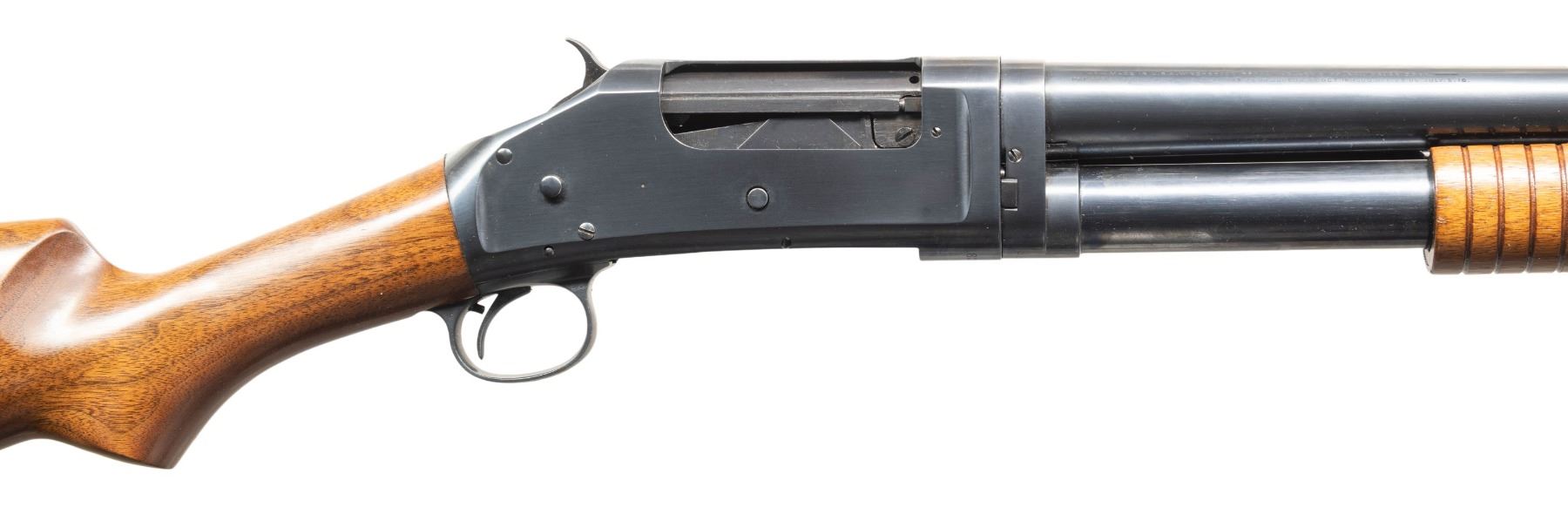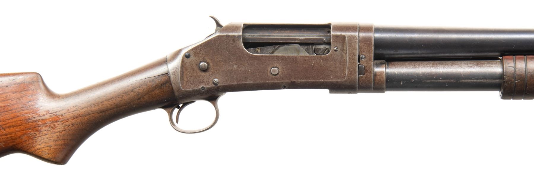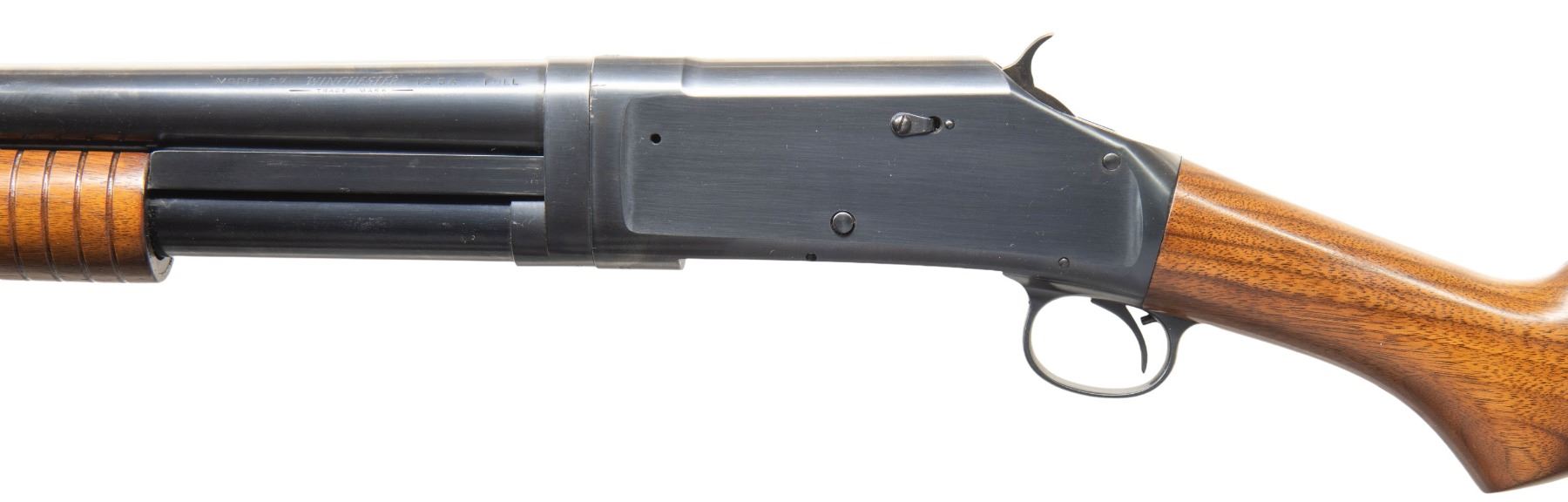 SHOTGUNS. 1) Cal. 12 GA. S# E523544. Bbl. 28". Model 1897 pump action shotgun mfg. by Winchester in 1914. Top of the bbl. is marked with Winchester's 2-line mfg. and patent information, followed by "12 GA.", with a "MOD" choke marking stamped on the left. Metal components exhibit a blue finish overall. Grooved wood pump with plain wood pistol grip buttstock and checkered black hard rubber Winchester buttplate. Brass bead front sight. Bbl. matches the receiver. CONDTION: receiver retains fair amounts of its original blue finish, exhibiting wear and thinning fading to gray patina, scattered superficial handling marks, as well as consistent light to mild surface oxidation overall. Bbl. retains large amounts of its original blue finish, exhibiting consistent light surface oxidation, with scattered patches of mild oxidation. Bore exhibits a consistent scattering of mild to moderate pitting. Proper manual mechanics. Wood furniture shows scattered marks and impressions from handling and storage, with the buttstock exhibiting a crack on either side of the wrist that stems from the receiver. (25-4752/MLW). 2) Cal. 12 GA. S# E839122. Bbl. 30". Model 1897 pump action shotgun mfg. by Winchester in 1936. Left side of the bbl. exhibits standard factory markings denoting the model and cal. designations, with Winchester's mfg. and patent information marked on the right. Metal components exhibit a professionally reapplied blue finish overall. Reproduction grooved wood pump and pistol grip buttstock with checkered black synthetic Winchester buttplate. Brass bead front sight. Bbl. collar matches the receiver. CONDITION: metal components retain the majority of their professionally reapplied blue finish, exhibiting some superficial handling marks, with some scattered spots of light pitting. Bbl. exhibits 2 small dings on the right side. Very bright bore, exhibiting some light to mild pitting beneath the bluing. Proper manual mechanics. Wood furniture is very good overall. Buttplate exhibits a large chip at and around the heel area of the buttstock. (25-4765/MLW). BOTH CURIO. $600-950.