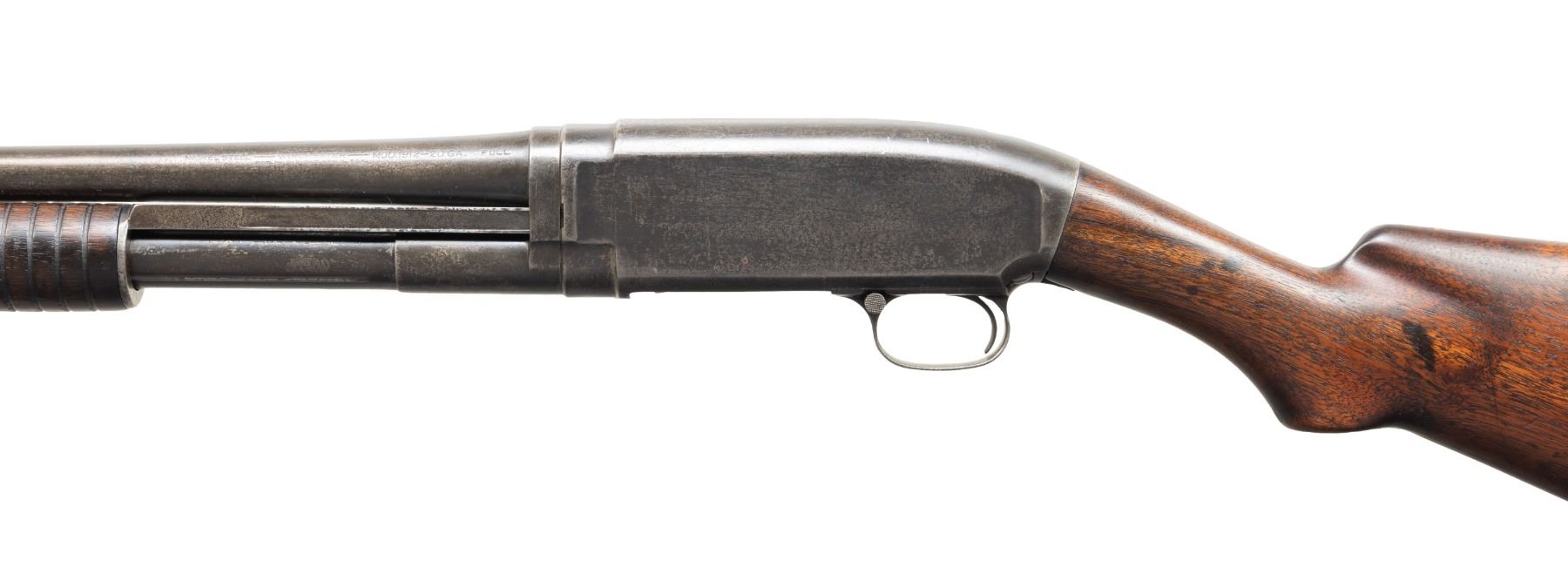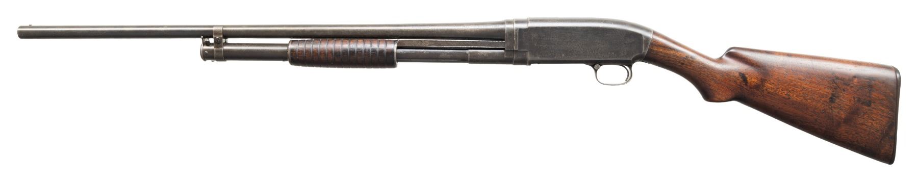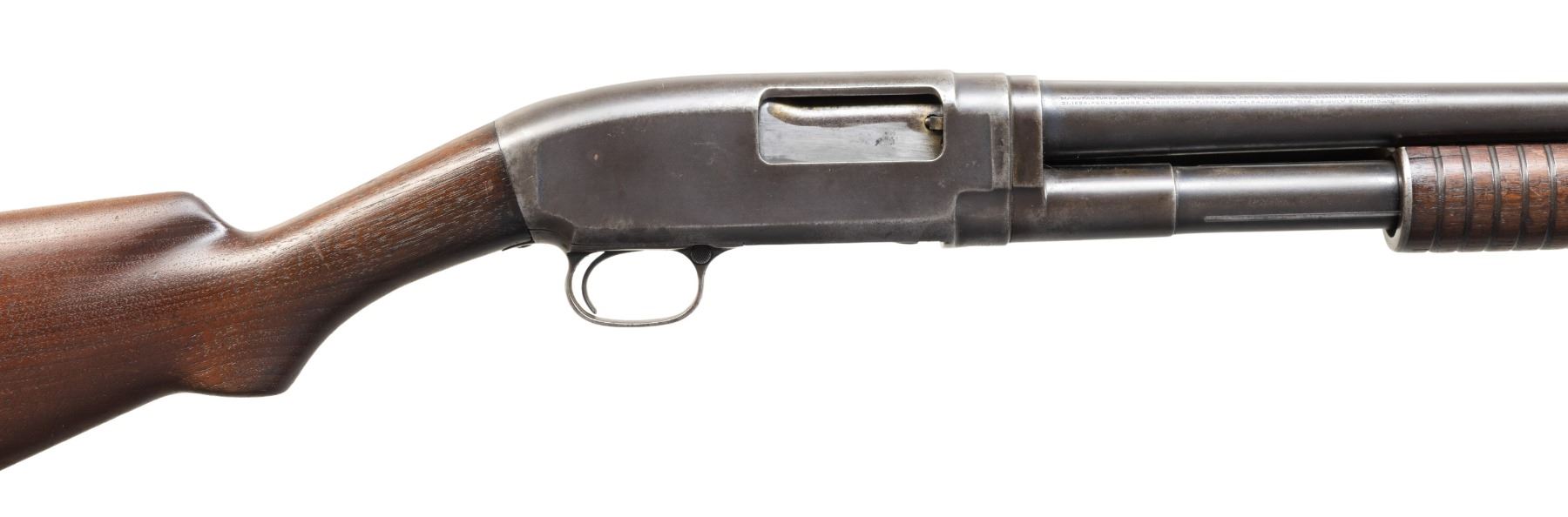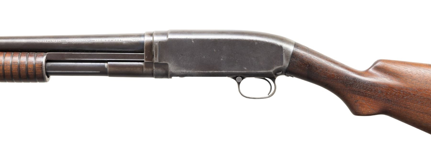SHOTGUNS. 1) FIRST YEAR OF PRODUCTION WINCHESTER MODEL 1912 PUMP ACTION SHOTGUN. Cal. 20 GA. S# 2344. Bbl. 25". Model 1912 pump action shotgun mfg. during the first year of production (1912). Left side of the bbl. is marked with the model and cal. designations, followed by a "FULL" choke marking, with Winchester's 2-line mfg. and patent information marked on the right. Grooved wood pump and plain wood pistol grip buttstock with checkered brown hard rubber Winchester buttplate. Brass bead front sight. Matching numbers are present on the receiver and receiver extension. CONDITION: metal components have faded to a dark mottled gray patina, exhibiting consistent light to mild pitting overall. Bore exhibits consistent mild to moderate pitting, predominately on the left side. Proper manual mechanics, although the firing pin appears to drop slightly before the bolt has locked into place. Wood furniture shows scattered marks and minor impressions from handling and storage, with the buttstock exhibiting 1 crack on the left side of the wrist and 2 on the right, all stemming from the receiver. (25-5475/MLW). 2) WINCHESTER MODEL 1912 PUMP ACTION SHOTGUN. Cal. 16 GA. S# 95875. Bbl. 26". Model 1912 pump action shotgun mfg. by Winchester in 1915. Left side of the bbl. is marked with the model and cal. designations, followed by a "MOD." choke marking, with Winchester's 2-line mfg. and patent information marked on the right. Metal components exhibit a blue finish overall, save for on the bolt, which is in-the-white. Sanded and refinished grooved wood pump and plain wood pistol grip buttstock with checkered brown hard rubber Winchester buttplate. Brass bead front sight. Matching numbers are present on the receiver and receiver extension. CONDITION: metal components retain fair amounts of their blue finish, exhibiting areas of wear and thinning fading to gray patina, with scattered superficial handling marks, as well as scattered spots/areas of light to mild surface oxidation and pitting. Bore exhibits consistent light to mild pitting, with scattered patches of moderate pitting. Action is worn, with the firing pin tripping before the bolt is closed, rendering the gun unsafe to fire. Wood furniture shows scattered marks and impressions from handling and storage, with 2 cracks present on the right side of the pump, and 1 crack present on the underside of the wrist. Buttplate exhibits a large chip at the toe area. (25-5483/MLW). BOTH CURIO. $500-700.