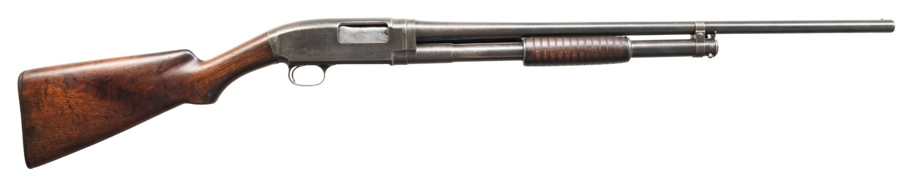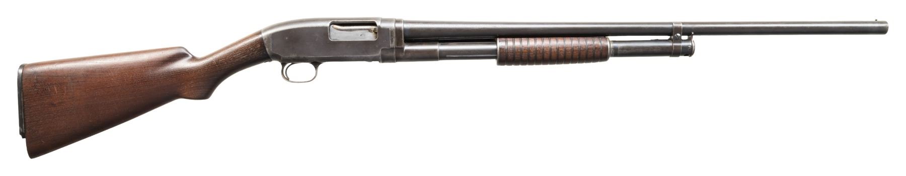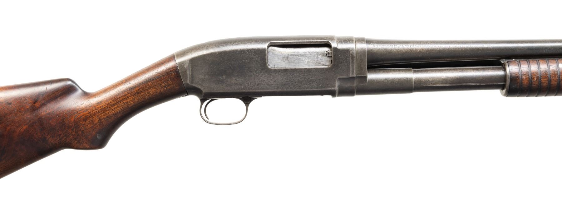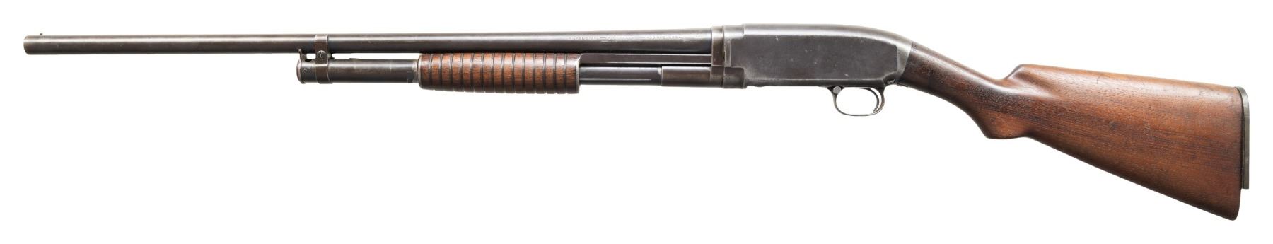 SHOTGUNS. 1) FIRST YEAR OF PRODUCTION WINCHESTER MODEL 1912 PUMP ACTION SHOTGUN. Cal. 20 GA. S# 2344. Bbl. 25". Model 1912 pump action shotgun mfg. during the first year of production (1912). Left side of the bbl. is marked with the model and cal. designations, followed by a "FULL" choke marking, with Winchester's 2-line mfg. and patent information marked on the right. Grooved wood pump and plain wood pistol grip buttstock with checkered brown hard rubber Winchester buttplate. Brass bead front sight. Matching numbers are present on the receiver and receiver extension. CONDITION: metal components have faded to a dark mottled gray patina, exhibiting consistent light to mild pitting overall. Bore exhibits consistent mild to moderate pitting, predominately on the left side. Proper manual mechanics, although the firing pin appears to drop slightly before the bolt has locked into place. Wood furniture shows scattered marks and minor impressions from handling and storage, with the buttstock exhibiting 1 crack on the left side of the wrist and 2 on the right, all stemming from the receiver. (25-5475/MLW). 2) WINCHESTER MODEL 1912 PUMP ACTION SHOTGUN. Cal. 16 GA. S# 95875. Bbl. 26". Model 1912 pump action shotgun mfg. by Winchester in 1915. Left side of the bbl. is marked with the model and cal. designations, followed by a "MOD." choke marking, with Winchester's 2-line mfg. and patent information marked on the right. Metal components exhibit a blue finish overall, save for on the bolt, which is in-the-white. Sanded and refinished grooved wood pump and plain wood pistol grip buttstock with checkered brown hard rubber Winchester buttplate. Brass bead front sight. Matching numbers are present on the receiver and receiver extension. CONDITION: metal components retain fair amounts of their blue finish, exhibiting areas of wear and thinning fading to gray patina, with scattered superficial handling marks, as well as scattered spots/areas of light to mild surface oxidation and pitting. Bore exhibits consistent light to mild pitting, with scattered patches of moderate pitting. Action is worn, with the firing pin tripping before the bolt is closed, rendering the gun unsafe to fire. Wood furniture shows scattered marks and impressions from handling and storage, with 2 cracks present on the right side of the pump, and 1 crack present on the underside of the wrist. Buttplate exhibits a large chip at the toe area. (25-5483/MLW). BOTH CURIO. $500-700.