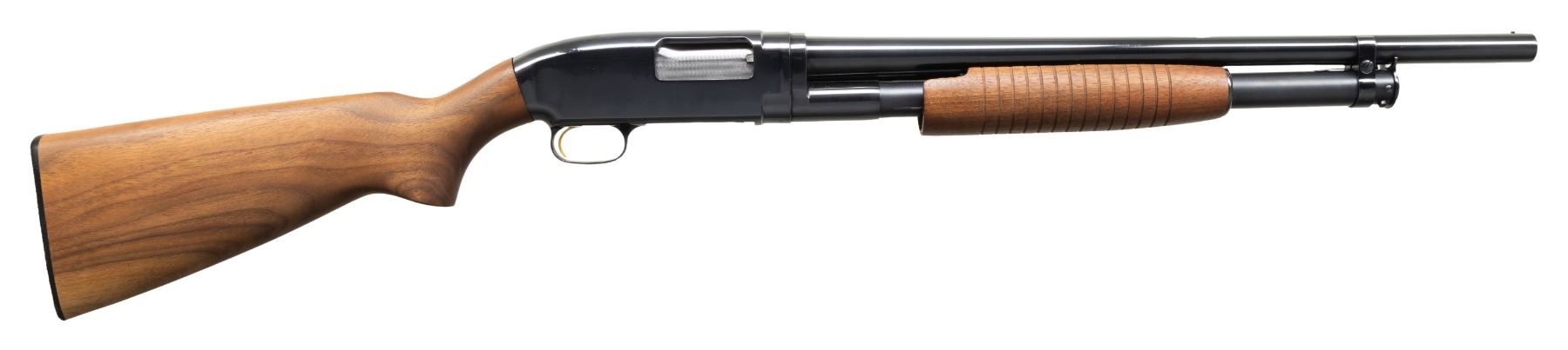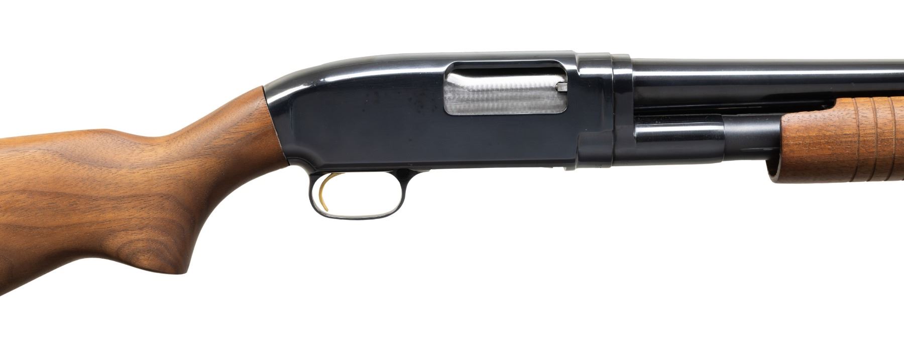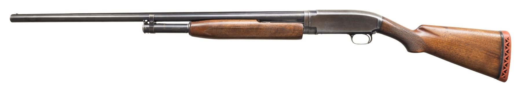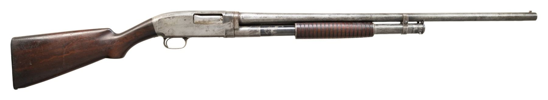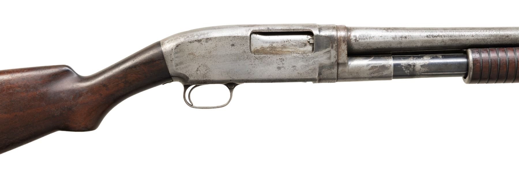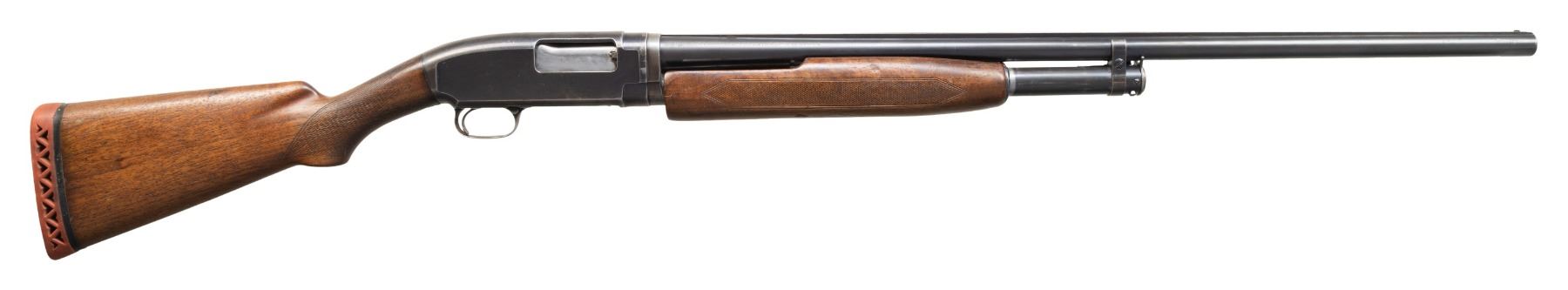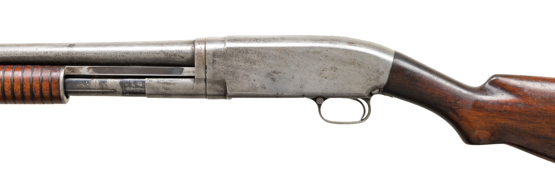 SHOTGUNS. 1) Cal. 12 GA. S# 117605. Bbl. 30". Model 12 pump action shotgun mfg. by Winchester in 1916. Left side of the bbl. is marked with the Winchester trademark logo, followed by the model and cal. designations, as well as a "FULL" choke marking, with Winchester mfg. and patent information marked on the right. Metal components exhibit a blue finish overall, save for on the bolt and carrier, which are polished in-the-white. Checkered wood forearm and checkered wood pistol grip buttstock with black synthetic spacer and Hawkins ventilated red rubber recoil pad. Solid matte rib. Natural white mid-bead. Bead front sight has broken off of its base and is absent. Matching numbers are present on the receiver and receiver extension. CONDITION: metal components retain fair to good amounts of their original factory blue finish, exhibiting wear and thinning fading to gray patina (predominately on the left and underside of the receiver, as well as on the bbl. extension), scattered superficial marks and scratches, as well as scattered spots and patches of light surface oxidation and pitting. Bright bore, exhibiting a few patches of light to mild pitting, as well as some hardened firing residue. Action does not function and requires gunsmith attention, with action slide cam appearing to catch on the bolt, resulting in the action freezing up. Wood furniture shows scattered marks and impressions from handling and storage, with the checkering on the forearm exhibiting smoothing. Right side of forearm exhibits a crack stemming from the rear, with 2 cracks present on the buttstock on the underside of the wrist, stemming from the trigger guard tang. (25-5351/MLW). 2) Cal. 12 GA, 2 3/4". S# 1685885. Bbl. 20 3/4". Model 12 pump action shotgun mfg. by Winchester in 1958. Left side of the bbl. is marked with the model and cal. designations above a "CYL" choke marking. Metal components exhibit a high polish reapplied blue finish finish overall, with the mag. tube exhibiting a dull reapplied blue finish. Bolt and carrier are polished and jeweled in-the-white. Trigger exhibits an apparent gold plated finish. Contemporary aftermarket grooved wood forearm and plain wood pistol grip buttstock with checkered black synthetic Winchester buttplate. Shortened bbl. is fitted with an aluminum bead front sight. Matching numbers are present on the receiver and receiver extension. CONDITION: metal components retain nearly all of their reapplied blue finish, exhibiting some scattered superficial handling marks, with scattered spots of light to mild pitting present beneath the bluing. Firing pin trips prior to the bolt fully locking closed and requires gunsmith attention to fire safely. Wood furniture is very good overall, save for a crack on the left side of wrist, stemming from the receiver. Buttplate shows scattered chips and a crack at the toe. (25-5470/MLW). 3) Cal. 12 GA. S# 238252. Bbl. 28". Model 12 pump action shotgun mfg. by Winchester in 1920. Left side of the bbl. is marked with the model and cal. designations, followed by a "FULL" choke marking, with Winchester's 2-line mfg. and patent information marked on the right. Sanded and refinished grooved wood pump and pistol grip buttstock with checkered brown hard rubber Winchester buttplate. Aftermarket bead front sight (bead broken off from base). Matching numbers are present on the receiver and receiver extension. CONDITION: metal components have been cleaned, exhibiting a gray patina, with scattered areas of light pitting and patches of mild pitting. Bore is bright, exhibiting scattered patches of light to mild surface oxidation. Proper manual mechanics. Wood furniture shows scattered marks and impressions from handling and storage, with the buttstock exhibiting a crack on either side of the wrist, stemming from the receiver, as well as a chip at the toe. Buttplate exhibits a large chip at the toe, with a crack stemming from the upper screw slot. (25-5472/MLW). ALL CURIO. $800-1,200.