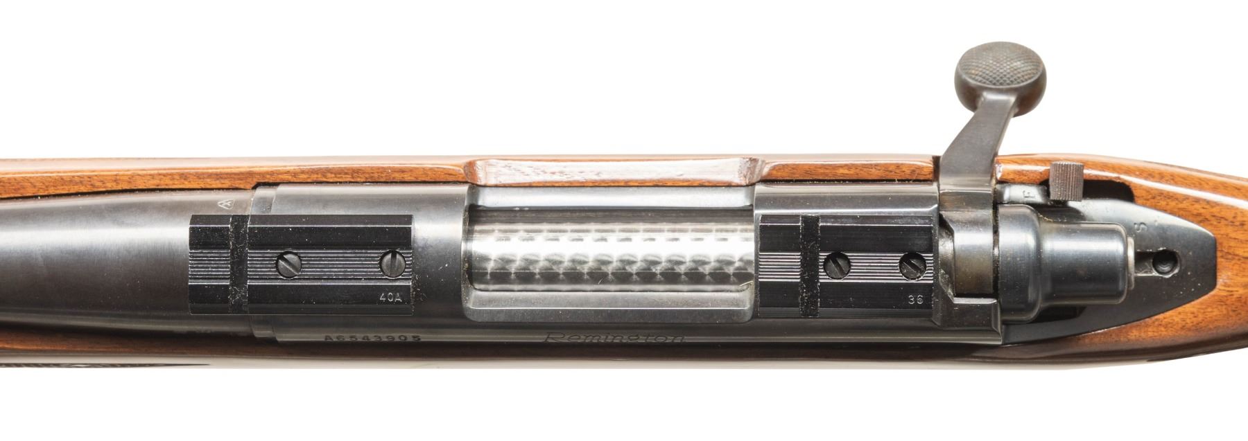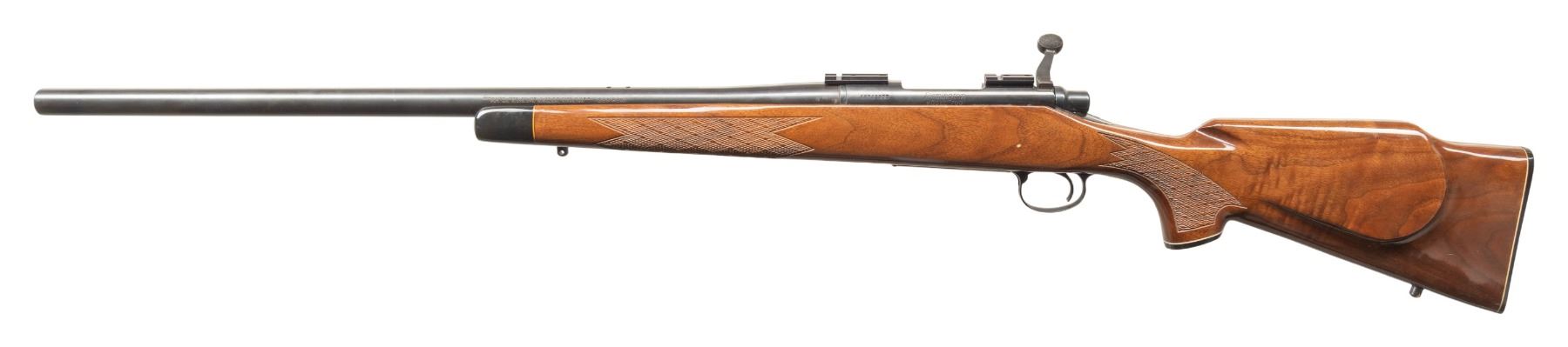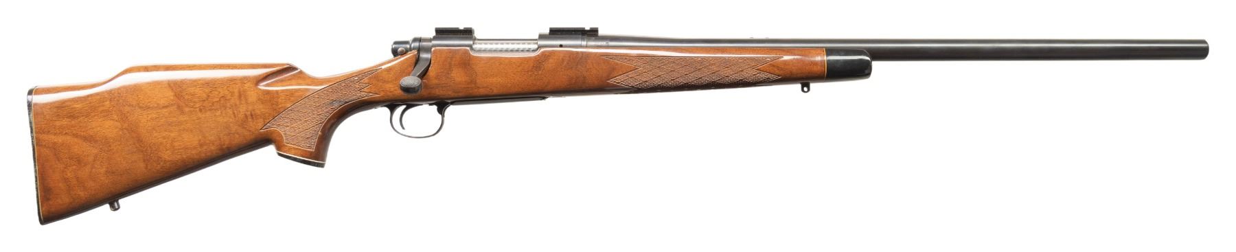 ACTION RIFLE. Cal. 223 Rem. S# A6543905. Heavy 24" w/ plug screws for rear sight base; code "XO" appears to indicate Dec. 1977 mfg. Push feed action has Weaver bases, matching numbered jeweled bolt, & internal box mag. with hinged floorplate. Checkered walnut stock w/ BDL features. CONDITION: near excellent metal finish. Very good wood finish with handling marks. Very good rifling. PROVENANCE: From the PMRB Collection. (25-5818/MD). MODERN. $800-1,200.