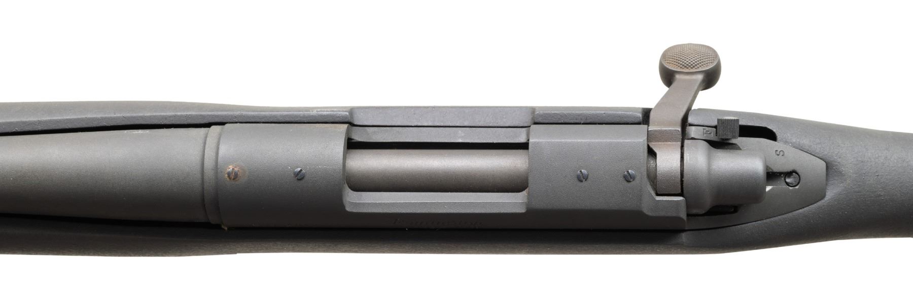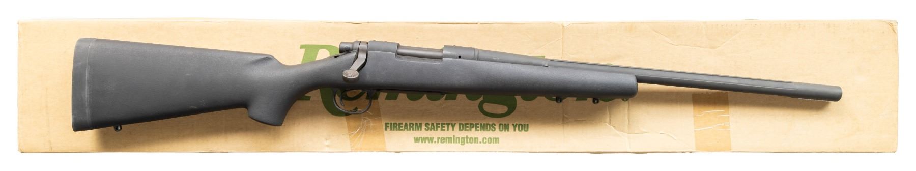 SPC BOLT ACTION RIFLE WITH MATCHING FACTORY BOX. Cal. 6.8mm Rem. SPC. S# G6514842. Bbl. 20". Model 700 LTR (Light Tactical Rifle) bolt action rifle mfg. by Remington. Left side of the bbl. is marked with Remington's single line address, followed by the cal. designation. Left side of the receiver is marked with the S#, followed by the Remington trademark logo above "MODEL 700". Metal components exhibit a matte black finish overall. 1-piece textured black fiber glass pistol grip buttstock with black rubber Remington recoil pad. Rnd. tapered fluted bbl. Top of the receiver is factory drilled and tapped with 4 plug screws. Bolt matches the receiver via "4842", which is faintly visible on the underside of the bolt body. UNATTACHED ACCESSORIES: matching factory cardboard box. CONDITION: near new, with metal components retaining virtually all of their original factory matte black finish, save for some wear that shows through to silvering at the rear of the bolt channel from insertion and/or operational wear. Brilliant mirror bore, retaining well defined rifling throughout. Proper manual mechanics. Stock is excellent overall. Box shows some light exterior wear, but otherwise remains sound. (25-5608/MLW). MODERN. $500-800.