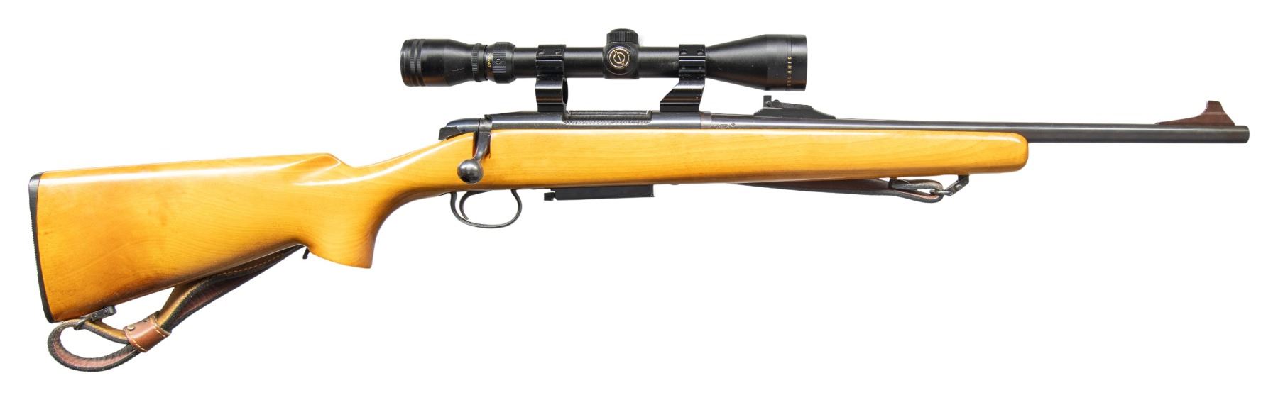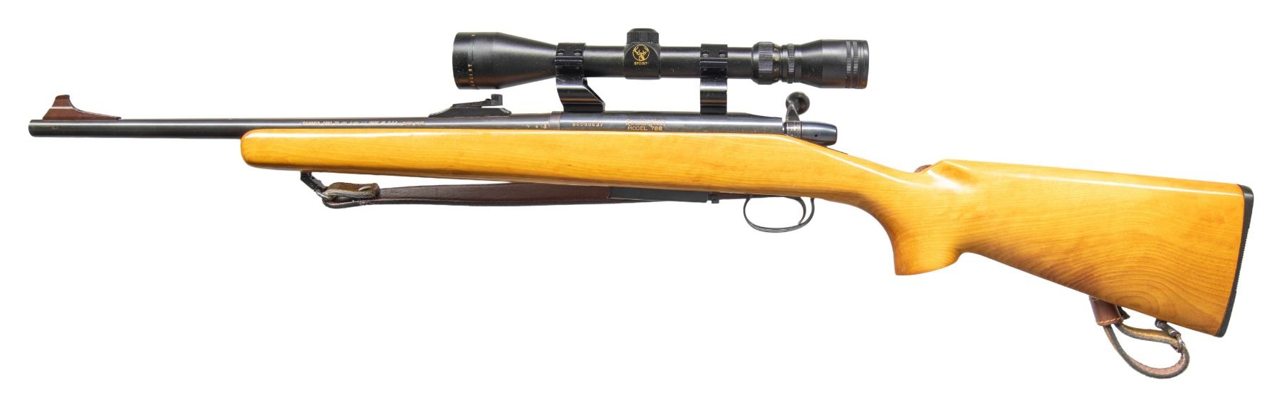 Cal. 243 Win. S# B6098637. Bbl. 18.5" with open sporting sights. Simmons 8 Point 3-9x40 scope on Holden Ironsighter rings. Walnut stock w/ brown leather sling. MAGS: 1 - 3 rd. CONDITION: very good to near excellent overall appearance with light handling marks. Very good rifling. Very good scope finish with serviceable optics. (25-4822/MD). MODERN. $300-500.