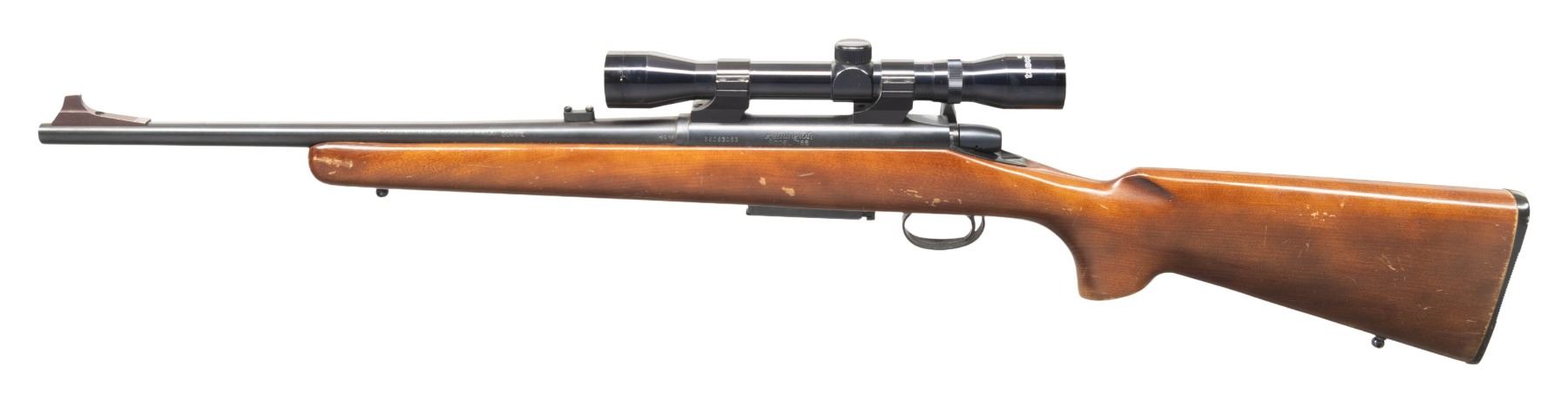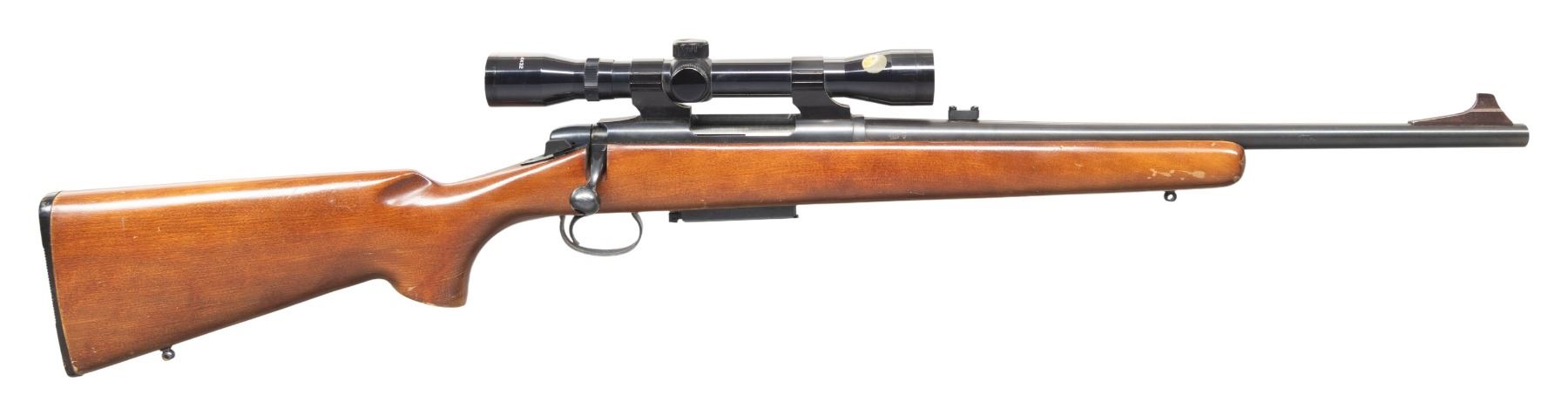 Cal. 308 Win. S# B6083053. Bbl. 18.5". Blade front sight & tall rear sight base. Tasco 4x32 scope. Walnut stock. MAGS: 1 - 3 rd. CONDITION: very good blue. Fair wood finish with numerous marks & peeling finish. Very good rifling with light fouling on lands. Very good scope finish with serviceable optics. PROVENANCE: From the PMRB Collection. (25-5828/MD). MODERN. $300-500.