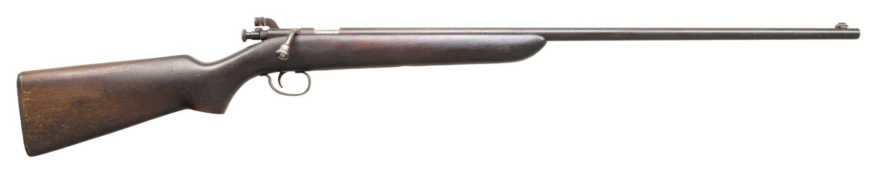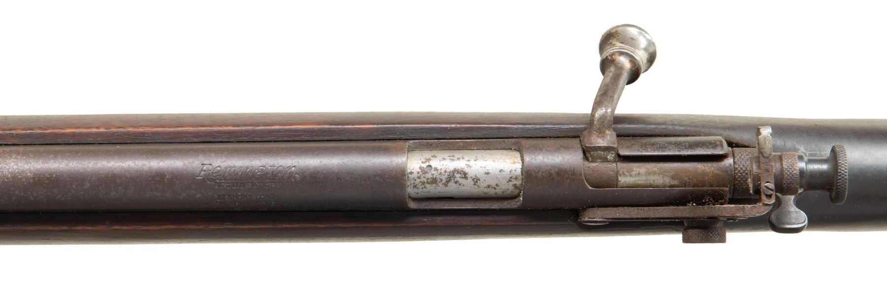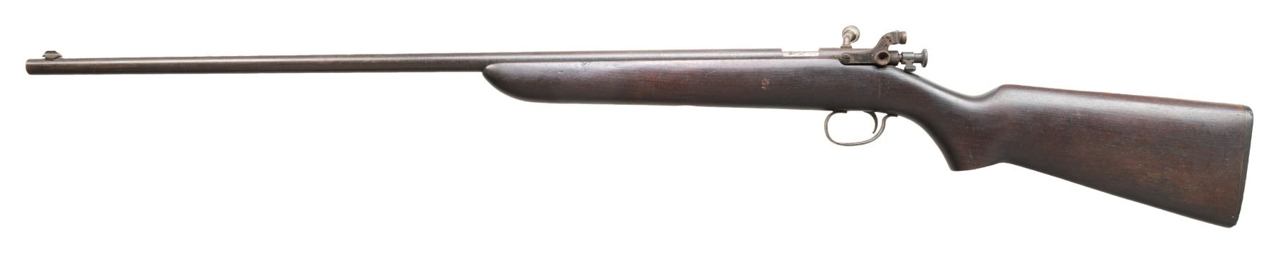 Cal. 22 S, L, LR. NSN. Bbl. 27". Model 41P single shot bolt action rifle mfg. by Remington circa. 1936-1939. Receiver / bbl. exhibit standard factory markings denoting the model and cal. designations. Metal components exhibit a blue finish overall, save for on the bolt body and handle, which exhibit an apparent plated finish. 1-piece plain wood pistol grip buttstock with Remington checkered brown hard rubber buttplate. Aftermarket Lyman natural white beaded blade front sight, with standard 41P adj. peep rear sight. CONDITION: metal components retain fair amounts of their original factory blue finish, exhibiting a consistent scattering of mild to moderate surface oxidation, with areas of wear fading to gray and brown patinas. Mirror bore, retaining strong rifling throughout. Proper manual mechanics. Front sight bead is chipped, but otherwise remains largely present. Stock shows scattered marks and impressions from handling and storage, but otherwise remains sound. Buttplate shows moderate wear. PROVENANCE: Estate of Groves Herrick. (25-5641/MLW). CURIO. $100-200.