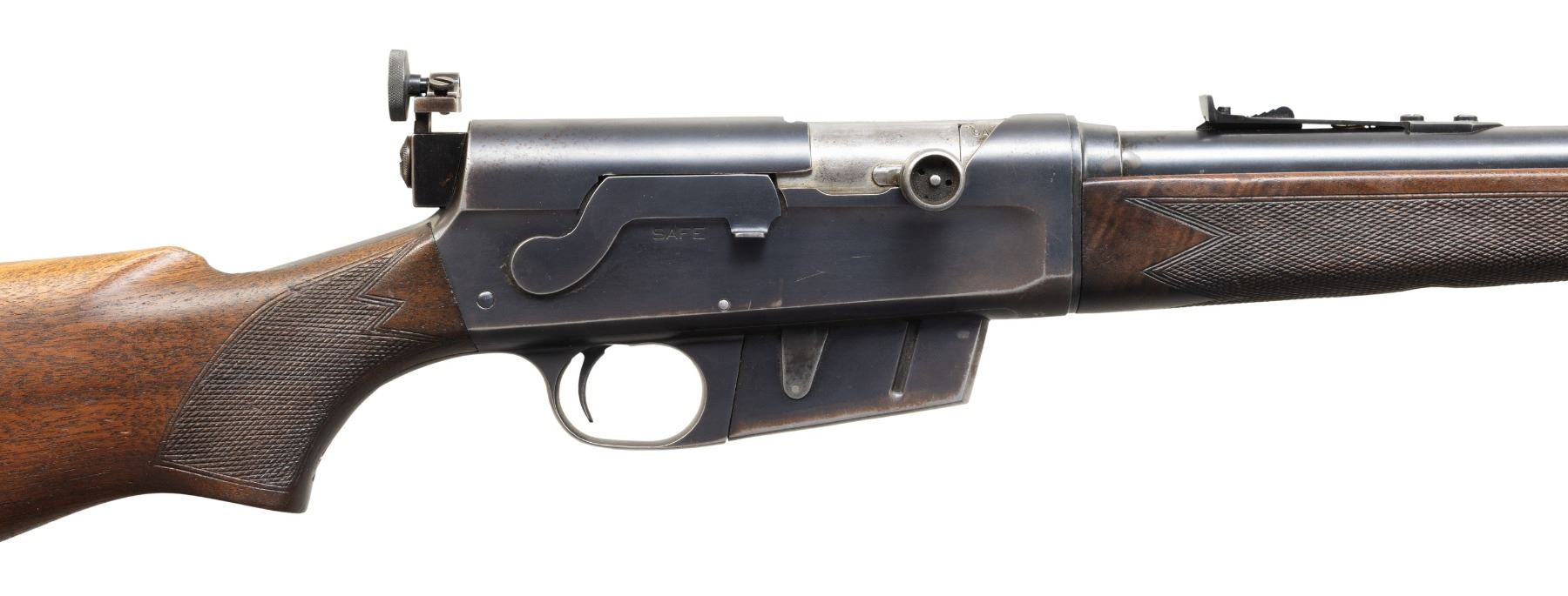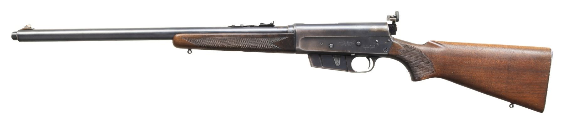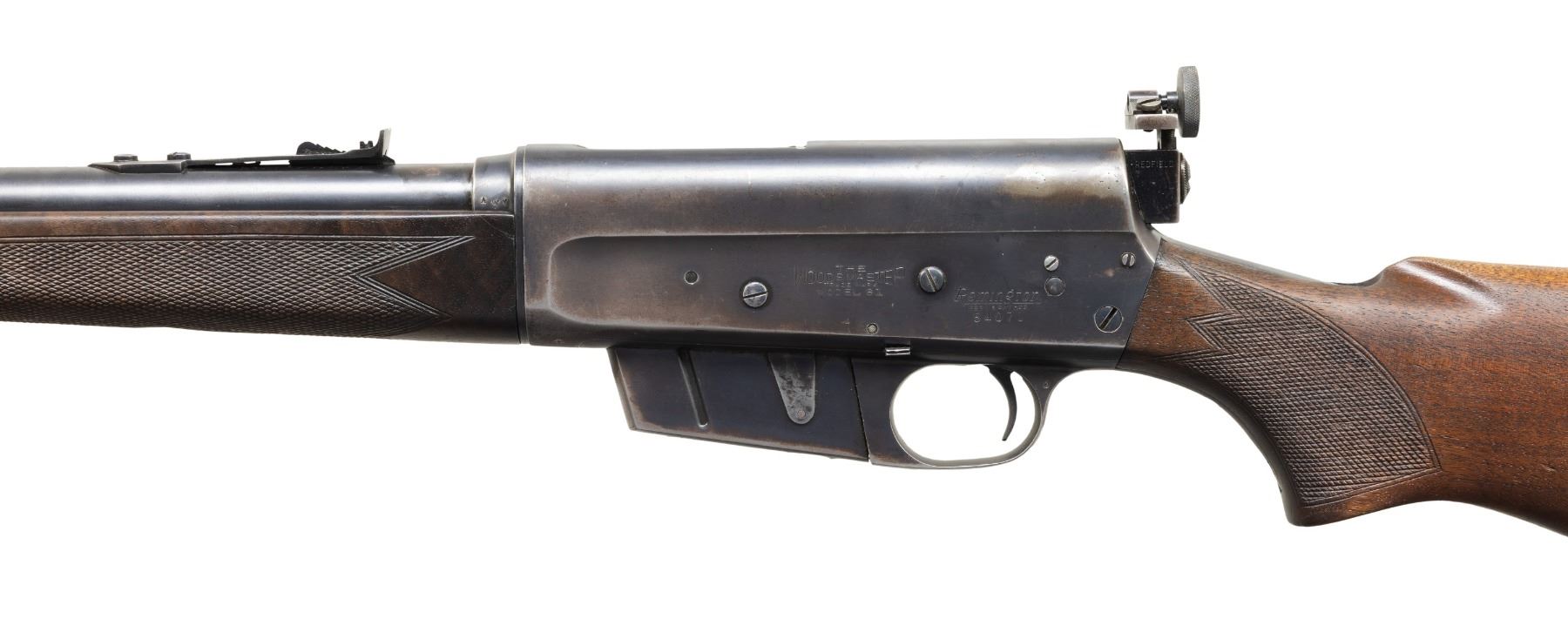 SEMI AUTO RIFLE. Cal. 300 Savage. S# 54071. Bbl. 23"; "AWW" code app appears to indicate March 1950 mfg. Barrel jacket has replacement blade front sight (with added white paint) & elevator rear sight. Action has mismatched "35" marked extractor, Redfield aperture sight & 2 filled in drilled holes left side from previous sight base. Walnut stock set w/ checkered alloy buttplate, added sling eyes & 8 added kill notches on toeline. CONDITION: barrel jackets has good fading blue with spots of varnish. Receiver has fair fading blue fading to brown patina in carry areas & gray appearance in repaired areas. Lightly sanded & refinished wood has added checkering. Good worn rifling. Appropriate extractor should be sourced for proper extraction. (25-6601/MD). CURIO. $400-600.