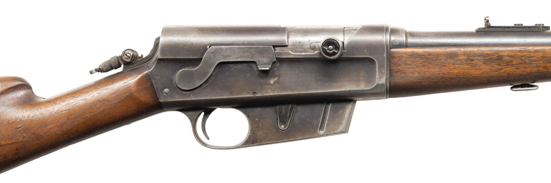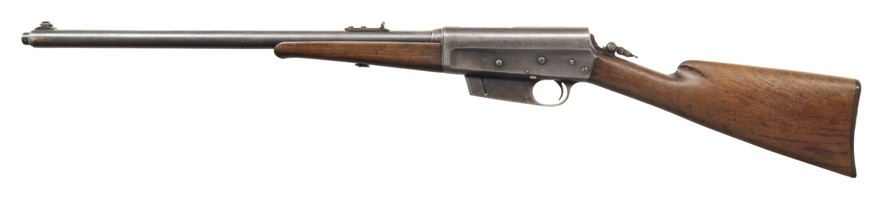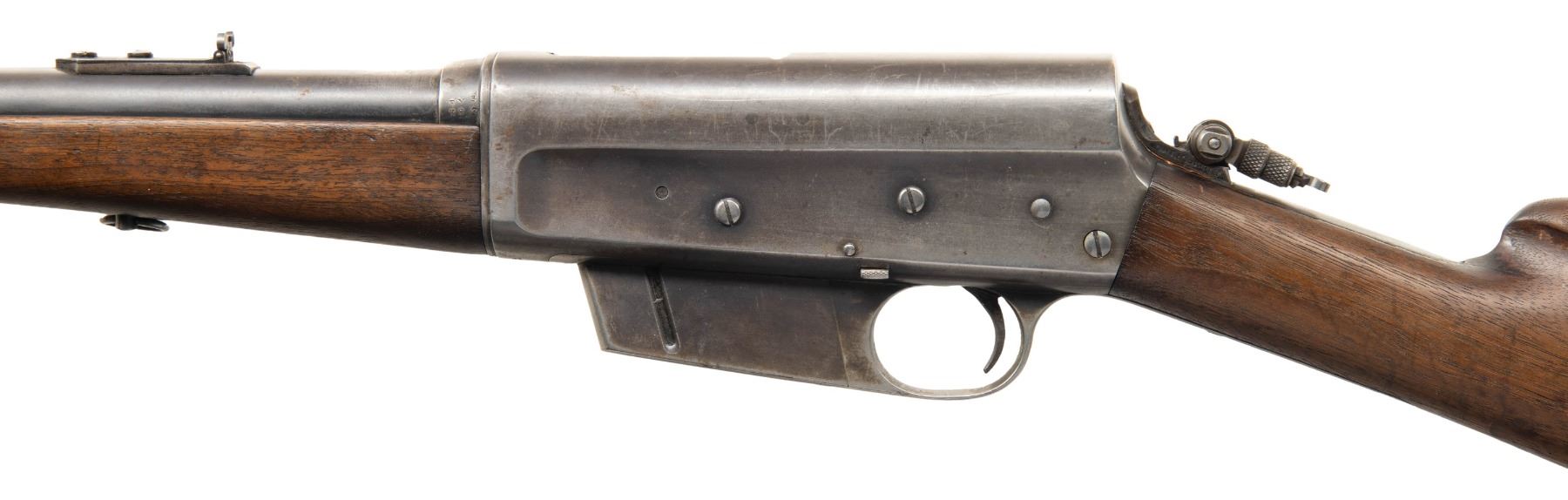 Cal. 35 Rem. S# 36615. Bbl. 22". Model 8 semi-automatic rifle mfg. by Remington. Top of the bbl. is marked with Remington 2-line mfg. and patent information, with "FY 3" and "KS 3" date codes marked on the left at the breech. Metal components exhibit a blue finish overall, save for on the bolt assembly and bbl., which are polished in-the-white. Plain wood schnabel tip forearm and straight grip buttstock with Remington UMC checkered brown hard rubber buttplate. Aftermarket Lyman natural white beaded blade front sight with Marbles flip-up U-notch rear sight, and Marbles flip-up tang sight. CONDITION: metal components retain fair to good amounts of their original factory blue finish, exhibiting areas of wear fading to gray patina, scattered handling marks, as well as scattered spots / areas of light surface oxidation overall. Bright bore, exhibiting consistent light pitting, while retaining well defined rifling throughout. Proper manual mechanics. Wood furniture shows scattered marks and impressions from handling and storage, with the buttstock exhibiting an approx. 1 1/2" crack on the right side, stemming from the receiver tang. (25-5712/MLW). CURIO. $300-500.