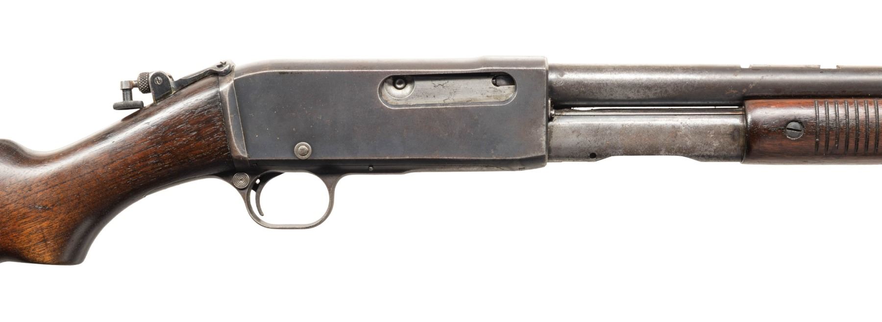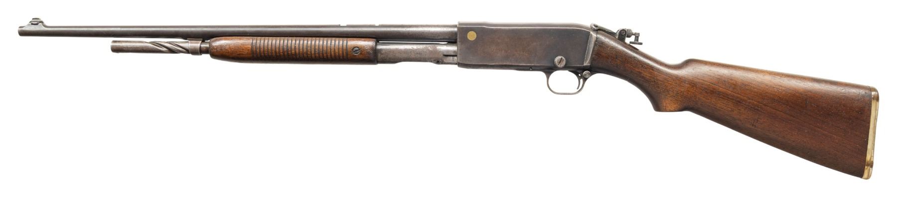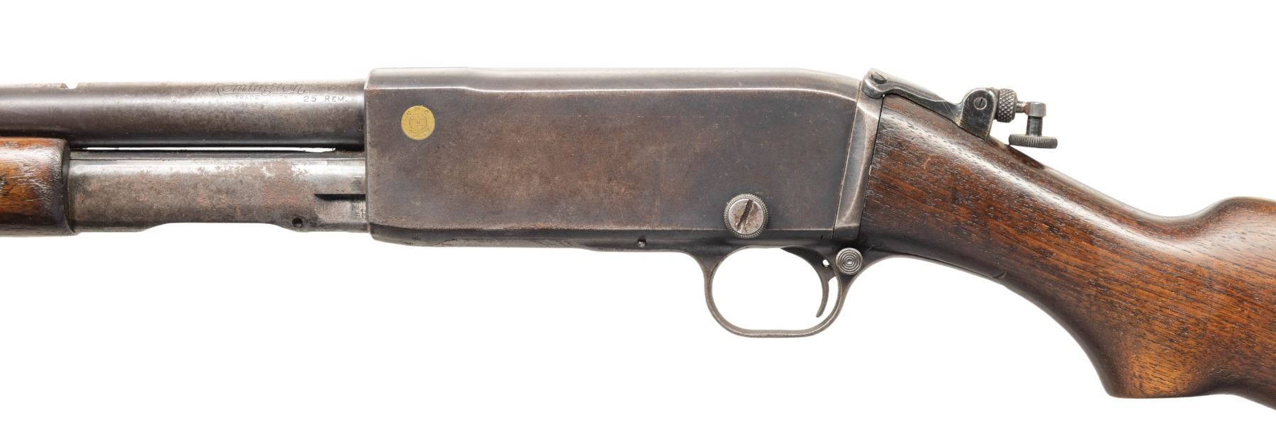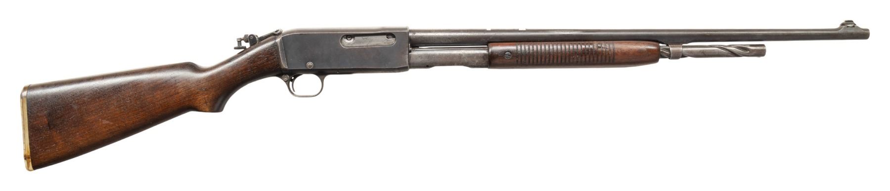 Cal. 25 Rem. S# C14794. Bbl. 22". Model 14 slide action rifle mfg. by Remington. Top of the bbl. is marked with Remington's 3-line mfg. and patent information, with the Remington trademark logo and cal. designation marked on the left. Left side of the receiver features a brass inlay marked "UMC/ U/ 25REM". Metal components exhibit a blue finish overall, save for on the bolt assembly, which is polished in-the-white/ Grooved wood pump and plain wood pistol grip buttstock with period replacement clear synthetic buttplate. Aftermarket Lyman natural white beaded blade front sight with Lyman flip-up tang sight. Factory rear sight is absent. CONDITION: metal components retain fair to good amounts of their original factory blue finish, exhibiting areas of wear and thinning fading to gray and brown patinas, as well as scattered spots and areas of light to mild surface oxidation overall. Left side of receiver and action bar exhibit patches of moderate surface oxidation. Bore is relatively bright, exhibiting consistent mild pitting, while retaining strong rifling throughout. Proper manual mechanics. Wood furniture shows scattered marks and impressions from handling and storage. Right side of pump exhibits a small chip, with a small crack present on the left side of the wrist of the buttstock, stemming from the receiver. PROVENANCE: Estate of Groves Herrick. (25-5709/MLW). CURIO. $300-500.