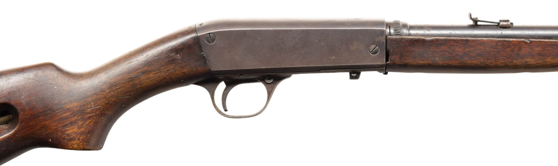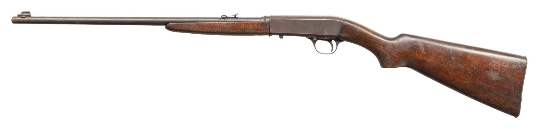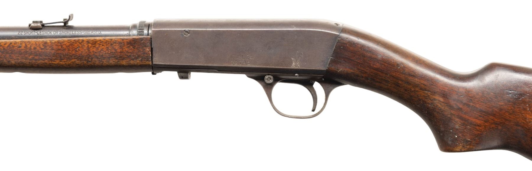 Cal. 22 Short. S# 72745. Bbl. 19 3/8". Model 24 semi-automatic rifle mfg. by Remington circa. 1922-1935. Top of the bbl. is marked with Remington's mfg. information, with the cal. designation marked on the left. Left side of the receiver is marked "MODEL 24" above the S#. Metal components exhibit a blue finish overall. Plain wood forearm and pistol grip buttstock with plain steel Remington UMC buttplate. Wood furniture has been sanded and refinished at one time. Marbles Sheard brass tipped blade front sight and elevation adj. rear sight. Lower assembly matches the receiver via "745". CONDITION: metal components retain fair amounts of their original factory blue finish, exhibiting consistent mild surface oxidation and areas of wear fading to gray patina overall. Very bright bore, exhibiting some scattered spots of light pitting and a ring bulge approx. 1" from the muzzle, while retaining strong rifling throughout. Proper manual mechanics. Wood furniture shows scattered marks and impressions from handling and storage, with the buttstock exhibiting a crack on the left side of the wrist, a crack on the underside of the wrist, as well as bubbling and flaking to its varnish finish. PROVENANCE: Estate of Groves Herrick. (25-5741/MLW). CURIO. $200-300.