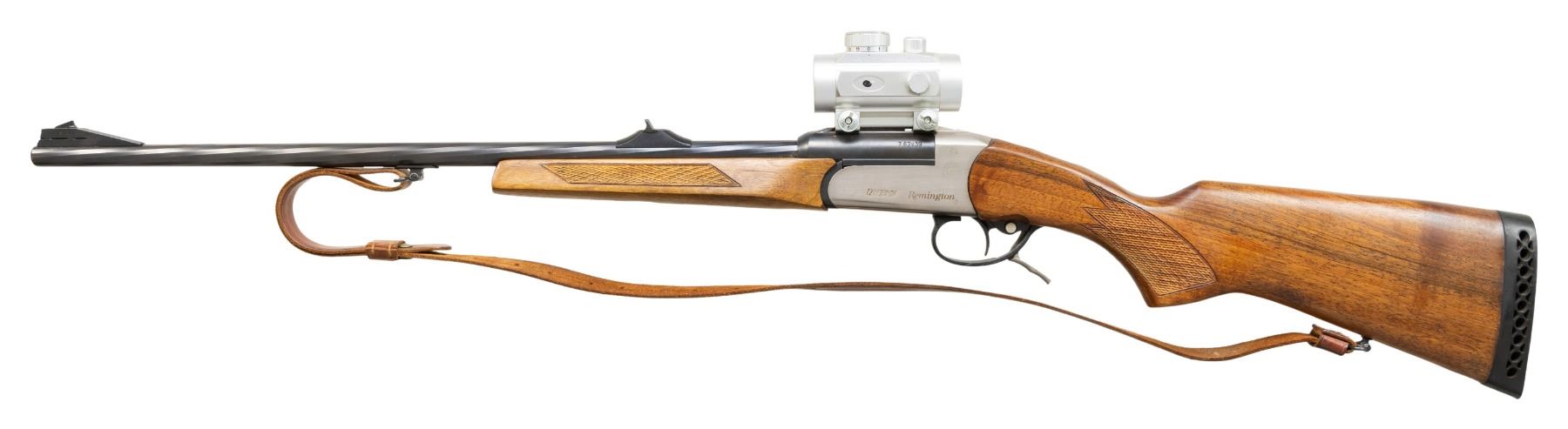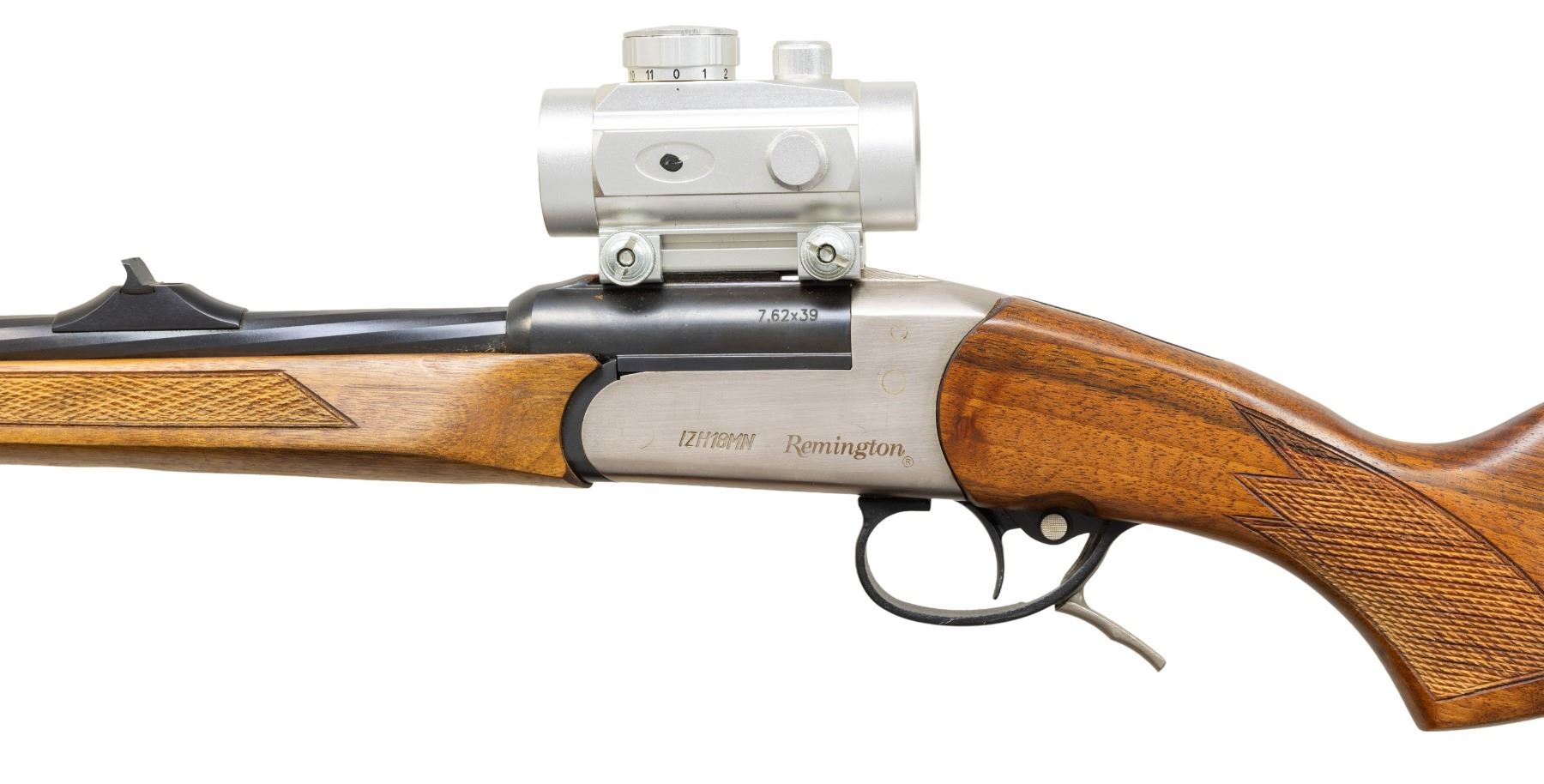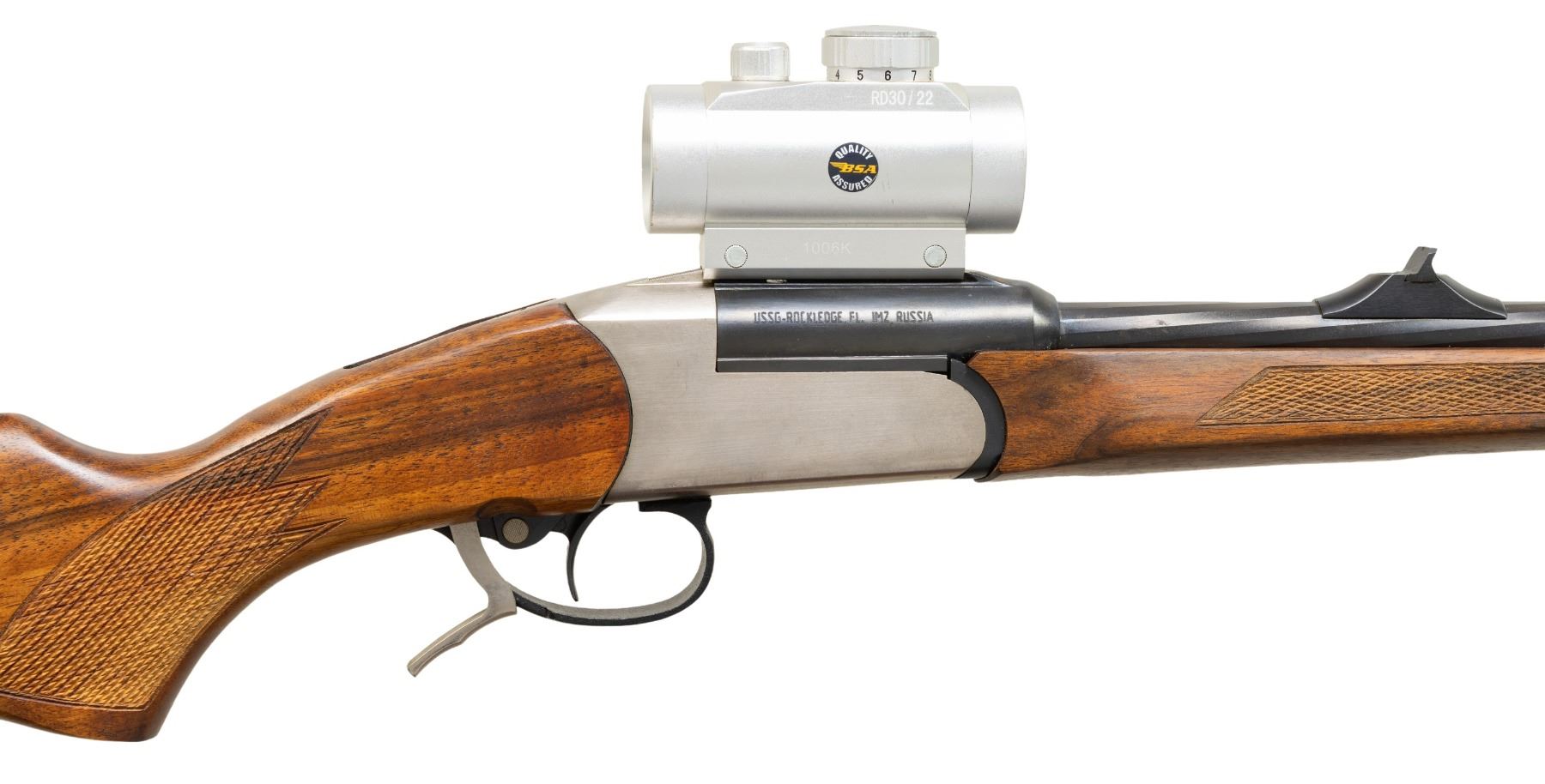 Cal. 7.62x39. S# O71845259R. Mfg. 2007 in Russia. Spiral cut fluted 23.5" bbl.; has USSG import mark. Iron sights along BSA red dot sight. Nickel finished boxlock action w/ underlever behind triggerguard. Checkered hardwood stock set w/ leather sling & black pad. CONDITION: near excellent overall w/ some spots of oxidation & slightly loose stock to frame. Very good rifling. Red dot sight appears functional in needing to clean lens. PROVENANCE: Estate of Groves Herrick. (25-5763/MD). MODERN. $300-500.