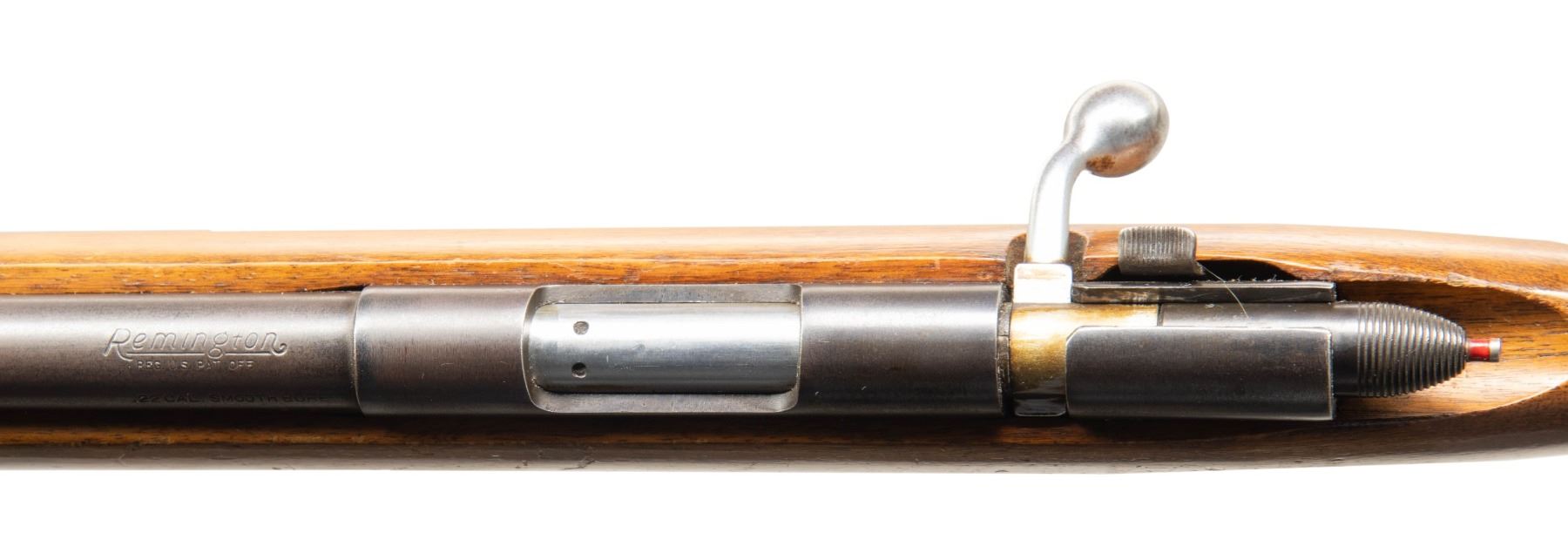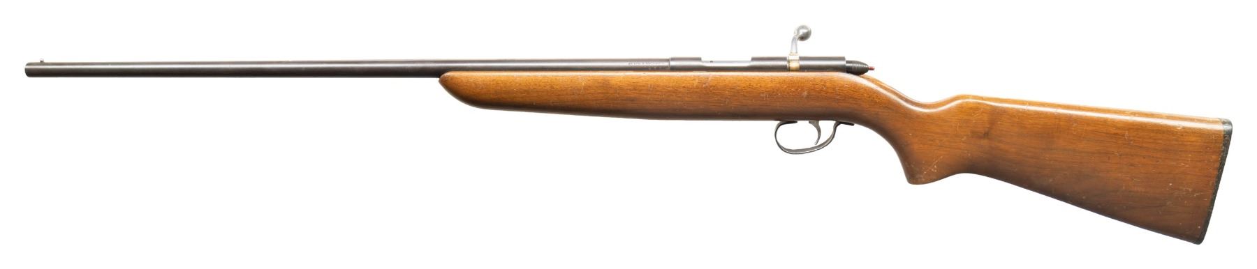 SINGLE SHOT BOLT ACTION SHOTGUN. Cal. 22 Smooth Bore. NSN. Bbl. 24 3/4". Model 510 (510SB) "Targermaster" single shot bolt action shotgun mfg. by Remington in 1954. Bbl. exhibits standard factory markings denoting Remington's mfg. information, as well as the model and cal. designations. Left side of bbl. exhibits an "AA" date code towards the breech. Metal components exhibit a blue finish overall, save for on the bolt body and handle, which are polished in-the-white. 1-piece plain wood pistol grip buttstock with checkered black synthetic Remington buttplate. Aluminum bead front sight. CONDITION: metal components retain large amounts of their original factory blue finish, exhibiting areas of wear and thinning that are fading to brown patina, with scattered spots of light surface oxidation present overall. Mirror bore. Proper manual mechanics. Stock shows scattered marks and minor impressions from handling and storage, but otherwise remains sound. PROVENANCE: From the PMRB Collection. (25-5853/MLW). CURIO. $400-600.