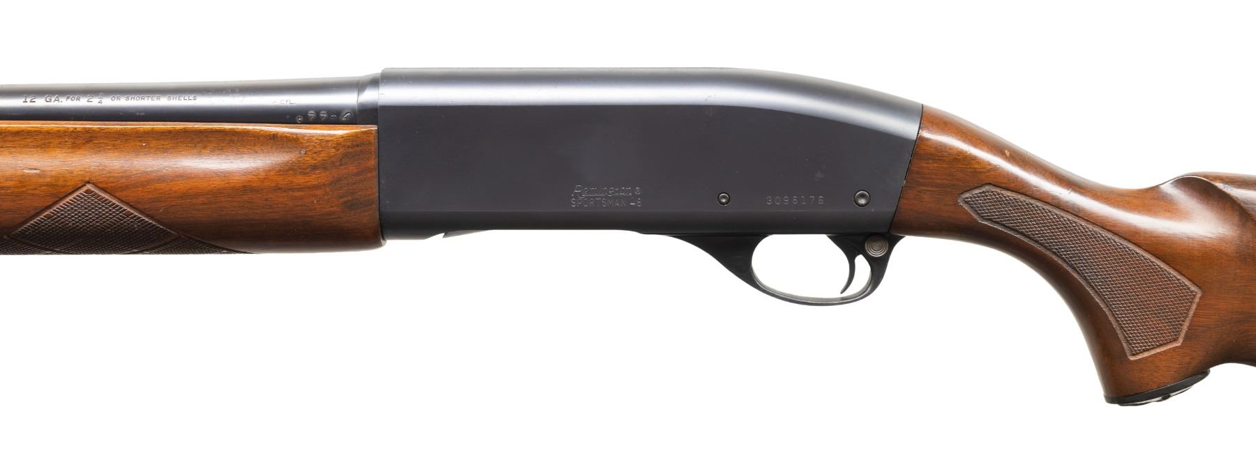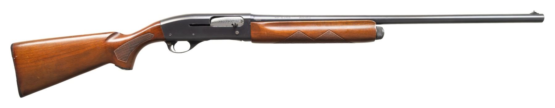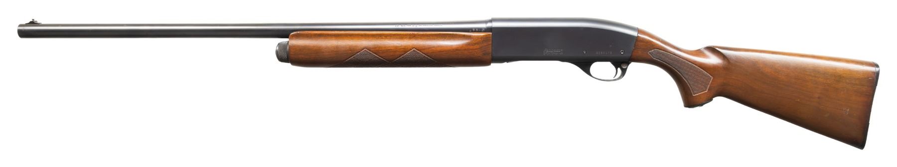 Cal. 12 GA, 2 3/4". S# 3096176. Bbl. 26 1/8". Sportsman 48 semi-automatic shotgun mfg. by Remington. Left side of the bbl. is marked with the cal. designation, followed by "IMP. CYL.", with Remington's mfg. and patent information marked on the right. Left side of the receiver is marked with the Remington trademark logo above "SPORTSMAN 48", followed by the S#. Metal components exhibit a blue finish overall, save for on the bolt and carrier, which have been jeweled in-the-white. Aluminum trigger housing exhibits a black enamel type finish. Checkered wood finger groove forearm, with checkered wood pistol grip stock featuring a brown synthetic grip cap embossed with a mallard, as well as a Remington grooved black synthetic buttplate. Aluminum bead front sight. CONDITION: metal components retain the majority of their original factory blue finish, exhibiting a few superficial handling marks, with scattered spots of light surface oxidation present overall. Mirror bore, exhibiting some streaks of hardened firing residue, as well as some apparent spots of light surface oxidation. Proper manual mechanics. Wood furniture shows scattered marks and small impressions from handling and storage, but otherwise remains sound. (25-4814/MLW). CURIO. $300-400.