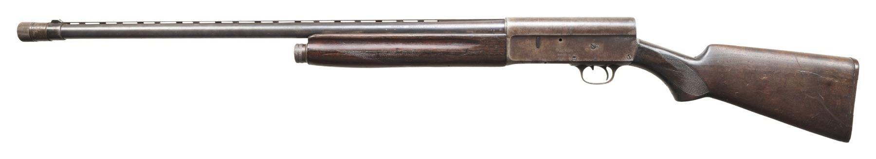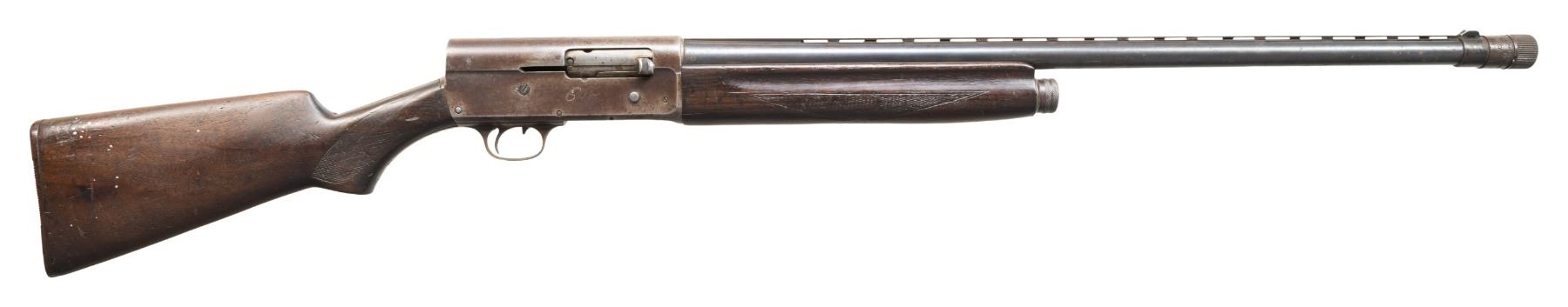 Cal. 12 Ga. S# 319636. VR 28" including Poly-Choke adj. choke. Action has hand scratched initials. Checkered walnut stock set w/ hard rubber buttplate. CONDITION: metal has brown patina appearance with pitting & oxidation. Worn wood finish with white paint, marks & cracks. Bore shows fouling & scratches. (25-5338/MD). CURIO. $200-400.