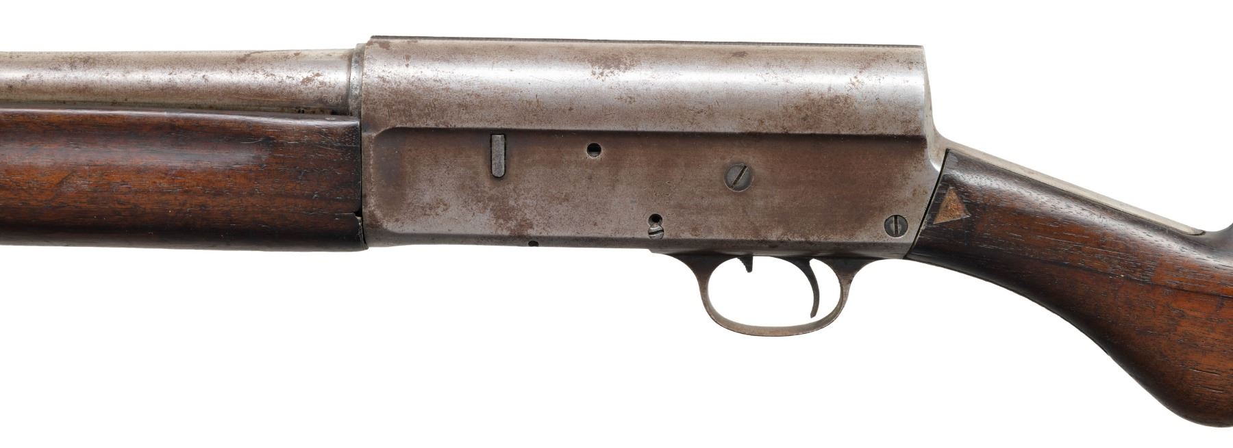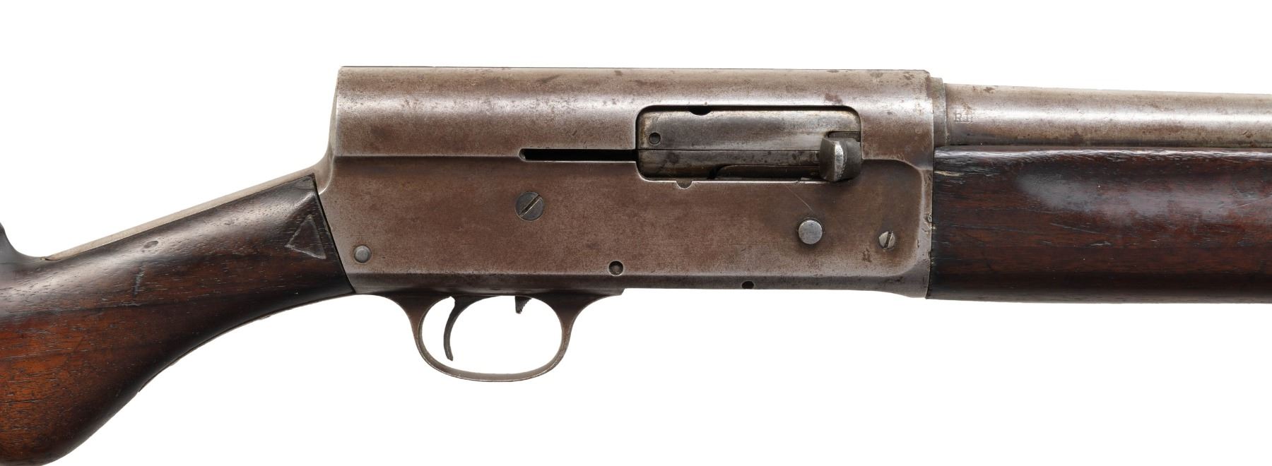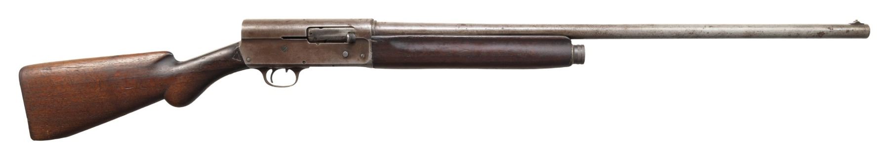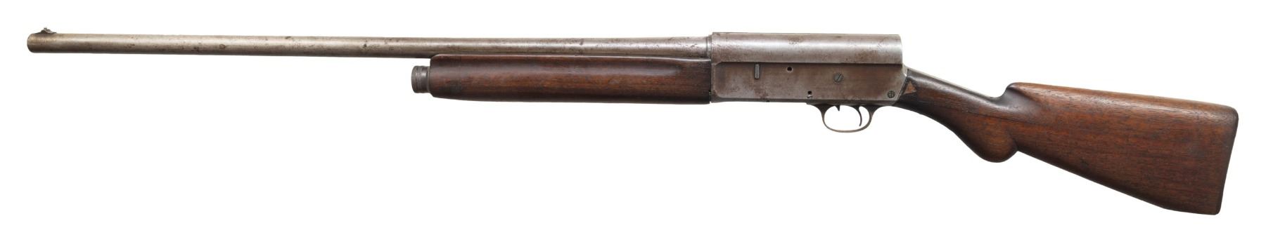 Cal. 12 GA. S# 92950. Bbl. 28". Model 11 semi-automatic shotgun mfg. by Remington. Top of the bbl. is marked with Remington's mfg. and patent information, with "FULL" marked on the left at the breech. Plain wood finger groove forearm and rnd. knob buttstock with Remington grooved brown synthetic buttplate. Sides of buttstock exhibit small hand carved diamonds on either side of the wrist. Aluminum bead front sight. CONDITION: metal components have faded to a mottled gray patina, exhibiting varying degrees of oxidation and pitting overall. Bright bore, exhibiting scattered spots of light to mild oxidation and pitting. Proper manual mechanics. Wood furniture shows scattered marks and impressions from handling and storage. Forearm exhibits chips and cracks along the rear stemming from the receiver. Buttstock exhibits scattered chips and a crack on the top of the wrist, with a large chip to the buttstock and buttplate present at the toe. (25-5307/MLW). CURIO. $200-300.