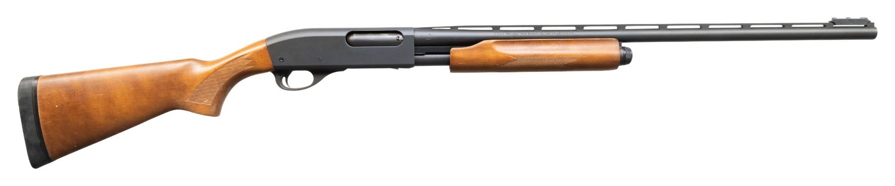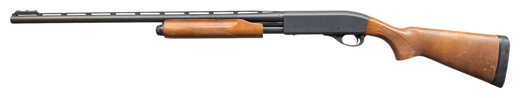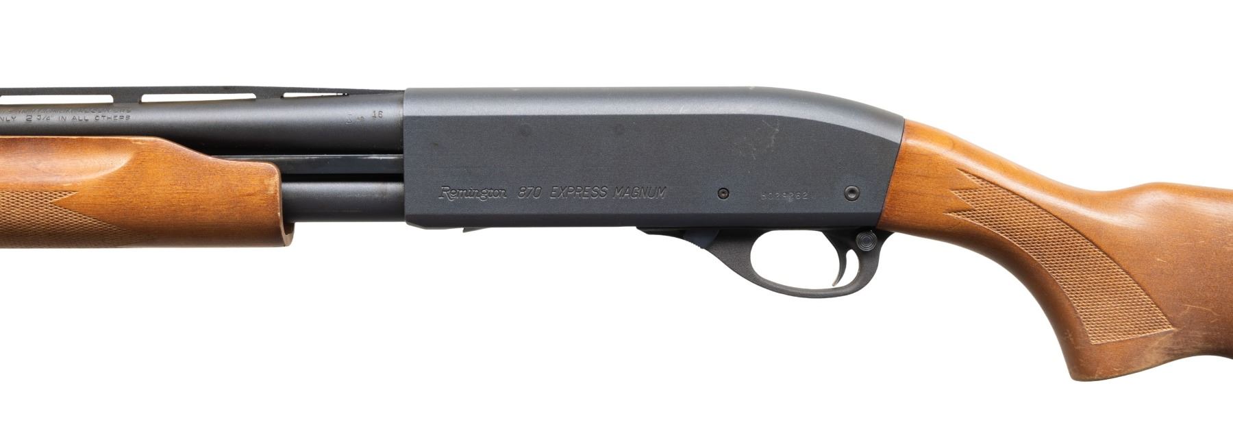 SHOTGUN. Cal. 20 GA, 2 3/4" or 3". S# B029262U. Bbl. 25 1/2". Model 870 Express Magnum pump action shotgun mfg. by Remington. Left side of the bbl. is marked with the cal. designation, with Remington's mfg. information marked on the right. Left side of the receiver is marked "Remington 870 EXPRESS MAGNUM", followed by the S#. Metal components exhibit a matte blue finish overall, save for on the aluminum trigger housing, which exhibits a matte black finish. Impress checkered wood pump with impress checkered pistol grip buttstock featuring a Remington black rubber recoil pad. Bbl. features a threaded Remington Modified choke, V/R, aluminum bead front sight, and added aftermarket red fiber optic front sight mounted behind the aluminum bead. CONDITION: metal components retain the majority of their original factory blue finish, exhibiting some spots of light wear, some superficial handling marks, as well as a few scattered spots of light to mild surface oxidation. Mirror bore. Proper manual mechanics. Wood furniture shows scattered marks and scratches from handling and storage, but otherwise remains sound. (25-4803/MLW). MODERN. $300-500.