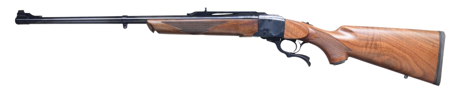 MATCHING FACTORY BOX. Cal. 30-06. S# 134-42963 Mfg. 2015 as Model 11387. The rifle features a blued finish on the receiver and a 24-inch round barrel. It is equipped with a bead front sight and an adjustable folding leaf rear sight on quarter rib. The frame is of falling block action configuration. The stock set includes a checkered Alex Henry forearm and a pistol grip buttstock with a Ruger metal grip cap. The buttstock is checkered and ends with a factory Ruger pad. UNATTACHED ACCESSORIES: factory box and scope rings. CONDITION: overall, the rifle is in near excellent condition. The barrel retains approximately 98% of its original finish. The receiver retains about 97% of its blued finish. The checkered Beavertail forearm and pistol grip buttstock are in excellent condition, with sharp checkering. The bore is bright with strong rifling. (24-2798/MD). MODERN. $700-1,000.