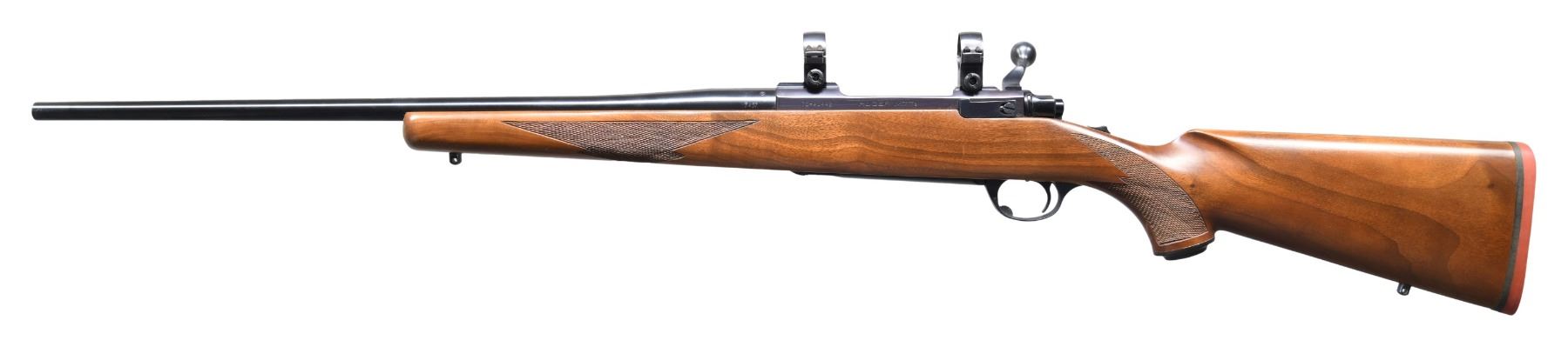 Cal. 7X57. S#. 70-40442. Bbl. 22" w/o sights. Action has top tang safety & Ruger rings. Walnut stock w/ cut checkering, swivel bases, grip cap & red pad. Early example with hollow bolt knob. CONDITION: over 98% original blue. Stock finish shows a few light marks. Bright near excellent bore. (24-3201/DS). MODERN. $600-900.